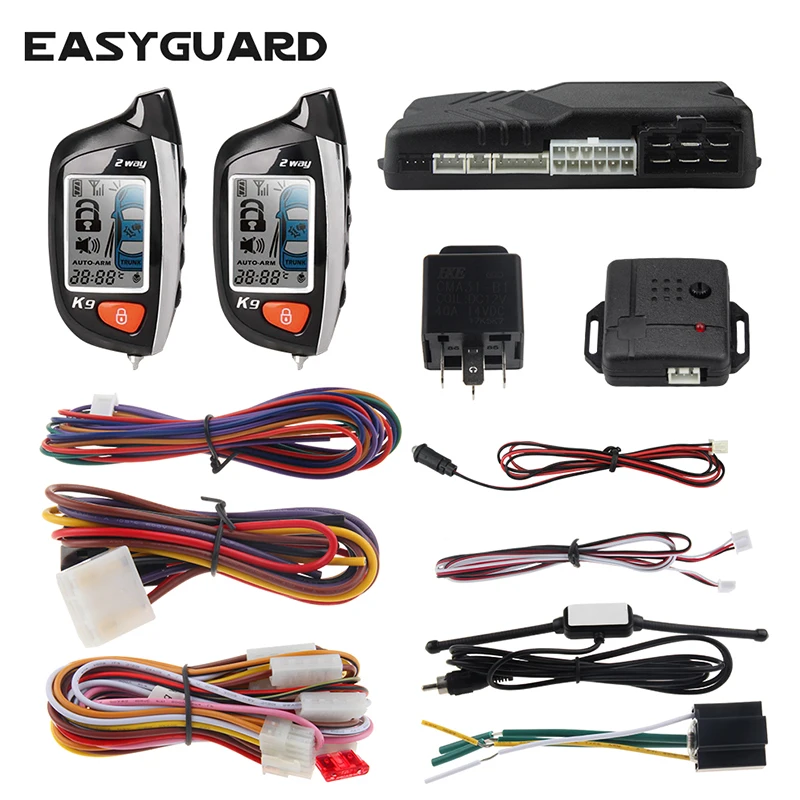Это двухсторонняя автомобильная сигнализация EASYGUARD с ЖК-дисплеем, дистанционным запуском и остановкой двигателя, таймером запуска двигателя и датчиком удара.