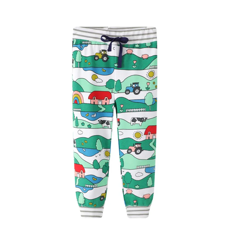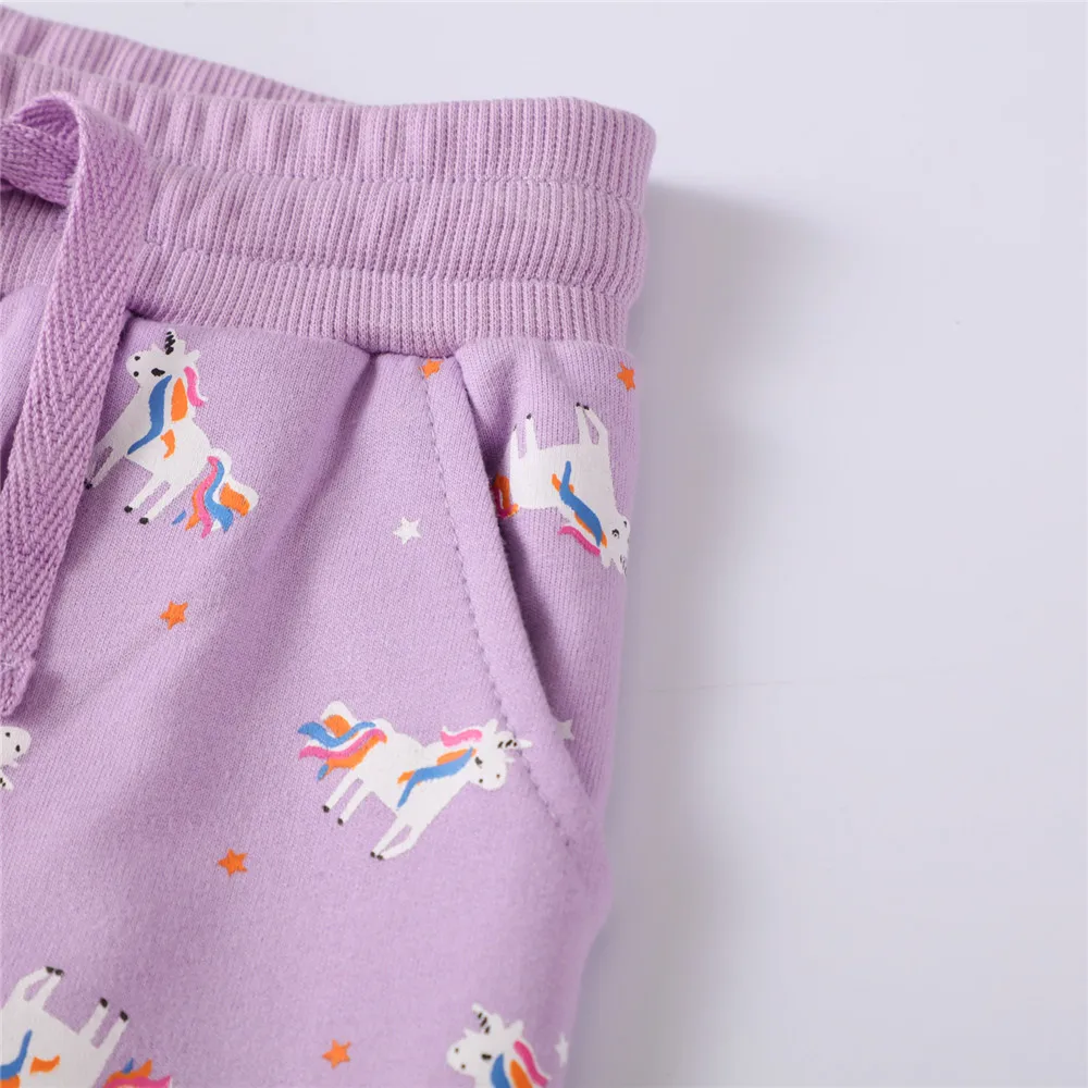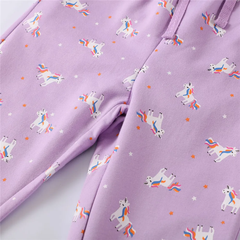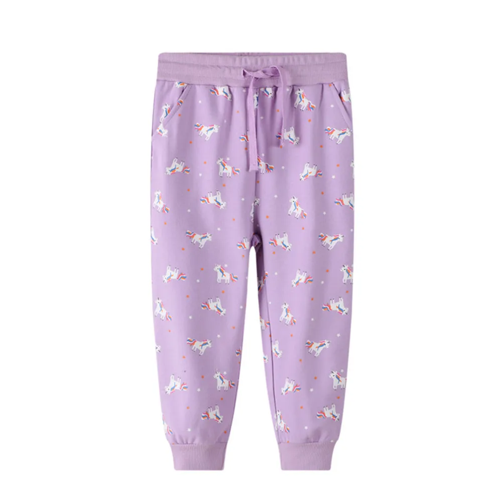 Jumping metersНовое поступление, фиолетовые длинные брюки, штаны для девочек, одежда, милые свободные детские спортивные штаны с принтом единорога