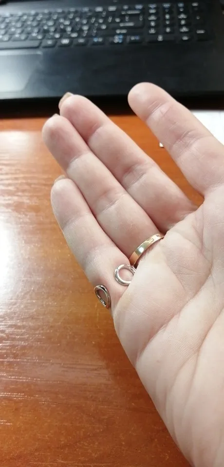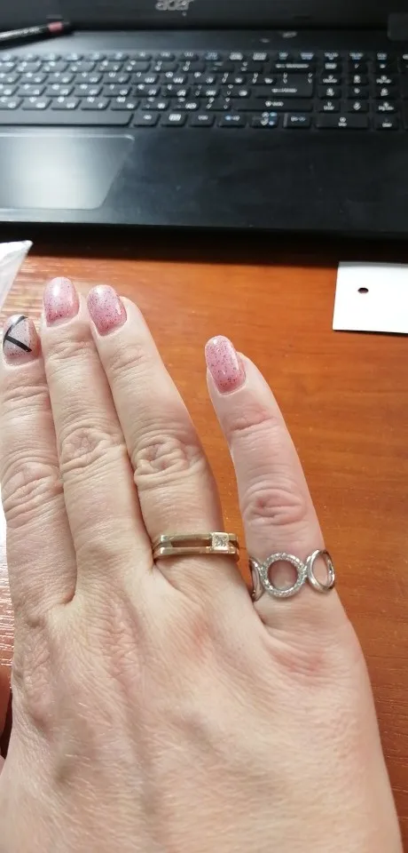 Колечко очень миленькое, но на тонкие пальцы. Мне подошло на безымянный палец с размером 16,5