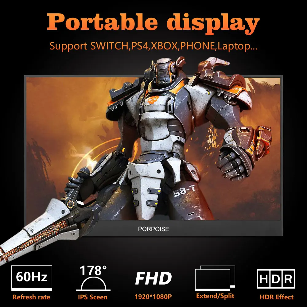Портативный монитор PORPOISE 1080P HDR IPS USB Type C HDMI для ноутбука, телефона, XBOX PS4, металлический игровой монитор