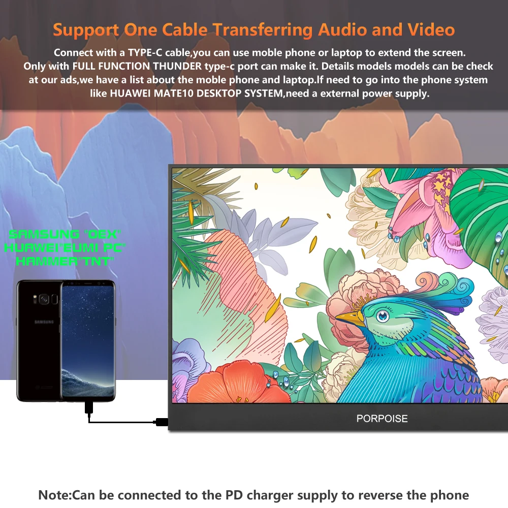 Вопрос: это нормально для одного типа C для кабеля TYPE C для подключения моего macbook и Samsung S8 +?О: Да, только один кабель подключен и может работать, не нужно зарядное устройство. Если требуется питание от macbook или мобильный телефон, можно использовать зарядное устройство PD для зарядки порта PD type c на мониторе. Затем он может перезарядить ваш macbook или S8 +. В: В чем разница между зарядным устройством 3.0 и зарядным устройством PD?A: обычное 5V-3A, 9V-2A,12V-1.5 многофункциональное зарядное устройство, только для поддержки монитора светильник. В то время как зарядное устройство PD может заряжать мобильный телефон или ноутбук. В: Поддерживает ли он какой-либо мобильный телефон с помощью TYPE-C?О: порт PORPOISE поддерживает только sup порт Thunder Type-C порт Мобильный телефон с помощью кабеля TYPE-C. В: поддерживает ли он любой ноутбук через TYPE-C?О: портативный монитор PORPOISE поддерживает только ноутбук Thunder TYPE-C с помощью TYPE-C-кабеля.В противном случае его необходимо подключить через кабель HDMI на ноутбуке. В: Как использовать его для подключения выключателя?A: сначала снимите контроллер переключателя, затем используйте кабель TYPE-C для подключения экрана переключателя,В то же время используйте зарядное устройство для подключения монитора через кабель USB-Type C. В: какая гарантия на монитор?О: PORPOISE предлагает нашим покупателям 7 дней без причины возврата, 15 дней без причины обмена, 1 год гарантии.В то время как любые Искусственные повреждения не будут пользоваться бесплатной гарантией. В: Нужно ли мне оплатить таможенный налог в моей стране?О: согласно aliexpress политике покупок, таможенный налог облагается покупателем.Портативный дисплей с узкими краями 4 ммПортативный дисплей с узкими краями 4 мм
