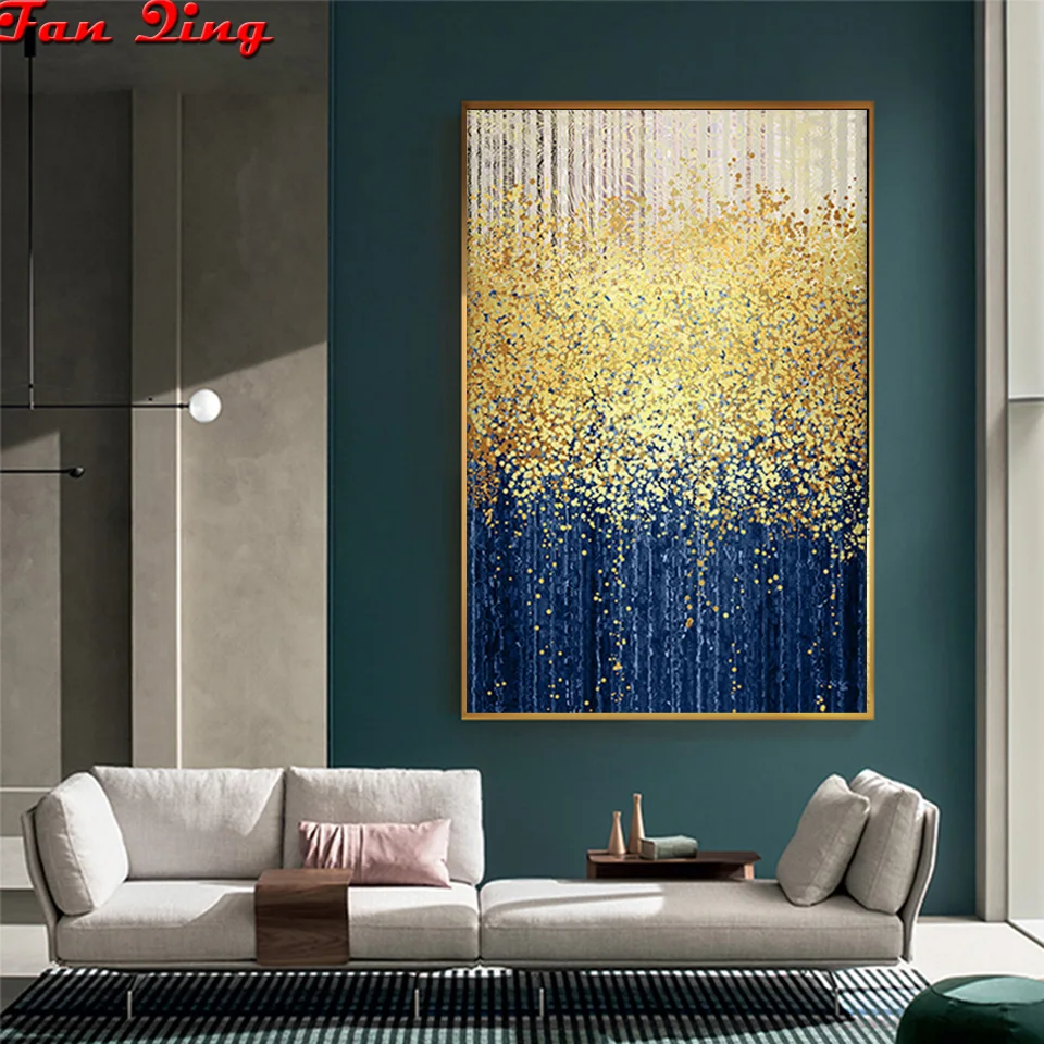 Алмазная картина 5d, 3 панели, золотистая, Синяя абстрактная вышивк...