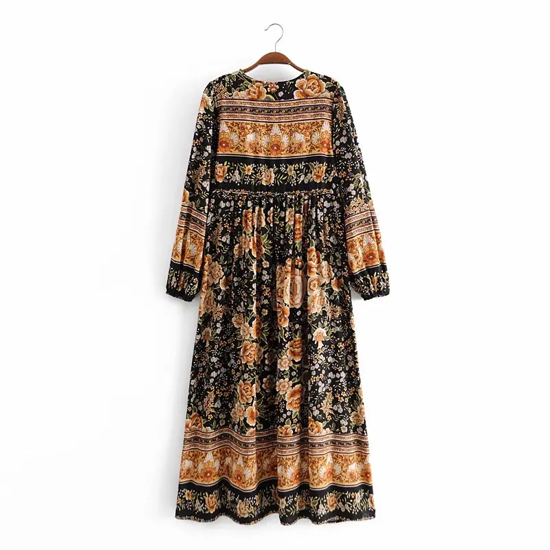 Винтажное шикарное Женское Платье макси с длинным рукавом, галстуком-бабочкой, этническим принтом, цветочным принтом, Пляжное богемное платье в стиле бохо, платья