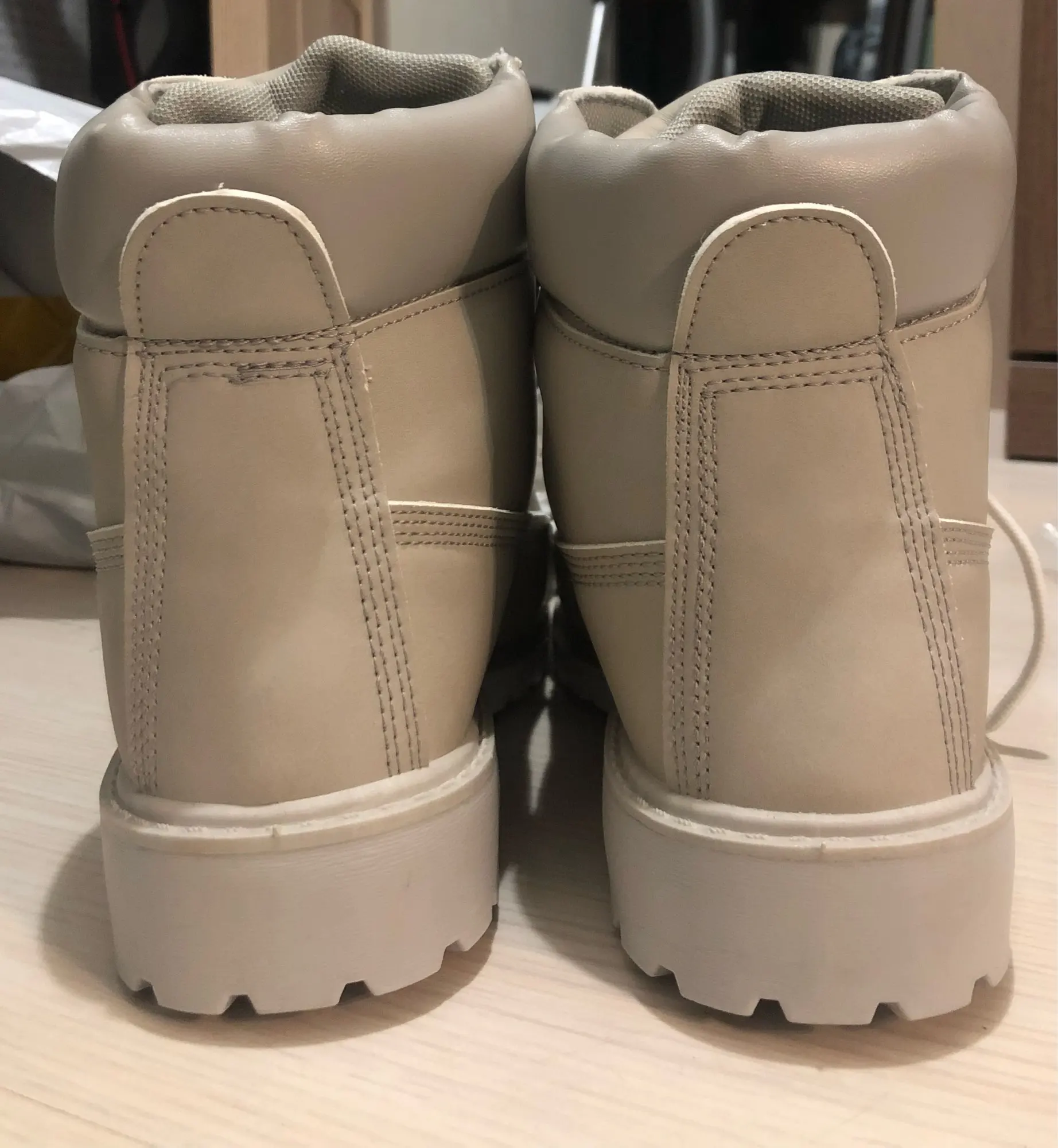 Ботинки вообще не как на фото. Все кривые косые, будто шили на одну ногу и не понятно где левый, а где правый. Сзади вообще кривые швы. Ботинки широкие будто на мужскую ногу. Написано «зимние», нифига они не зимние, внутри меха нет, и подкладки нет никакой. Ну короче Али есть Али, в них только на даче ходить.