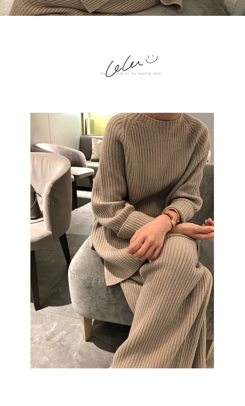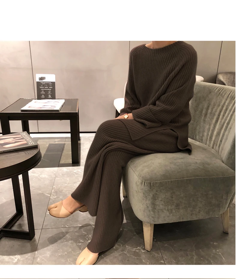 Женский трикотажный костюм, жаккардовый свитер с разрезом и длинными рукавами, брюки с широкими штанинами, Осень-зима 2020