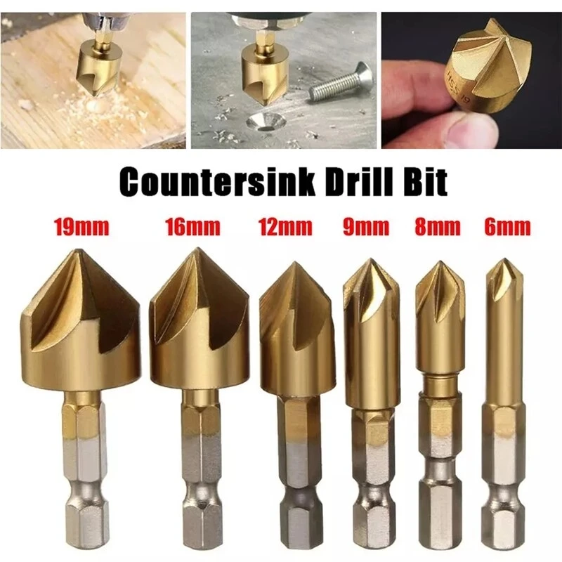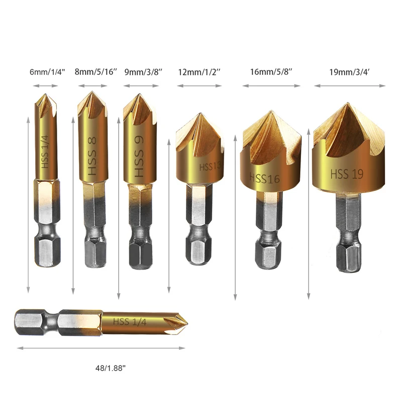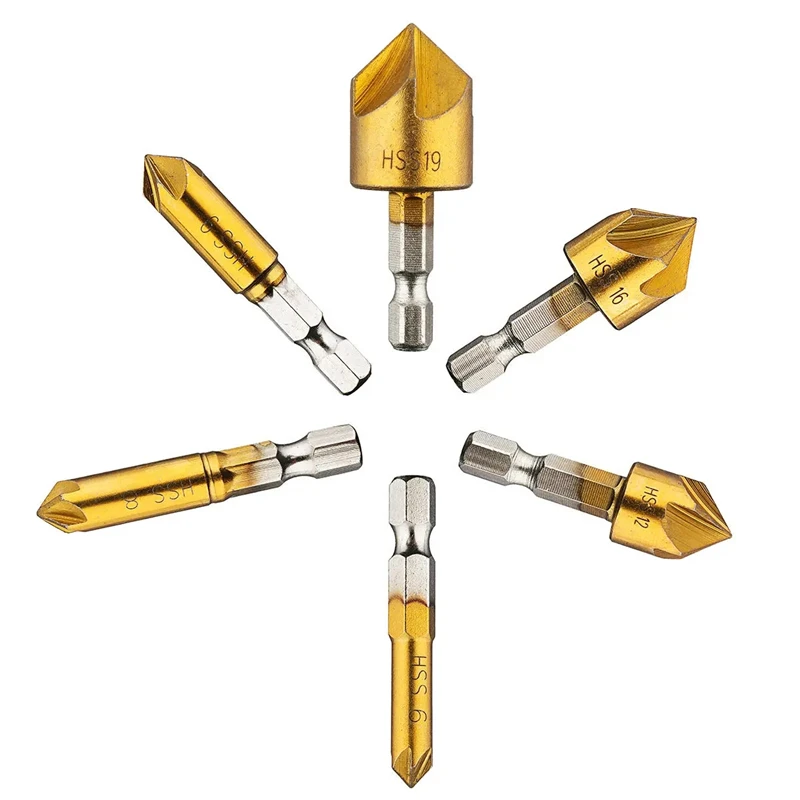 5 флейты 6-19 мм зенковки сверло 1/4 "Шестигранным хвостовиком Титан покрытием фасочный инструмент комплект 6/8/9/12/16/19 мм