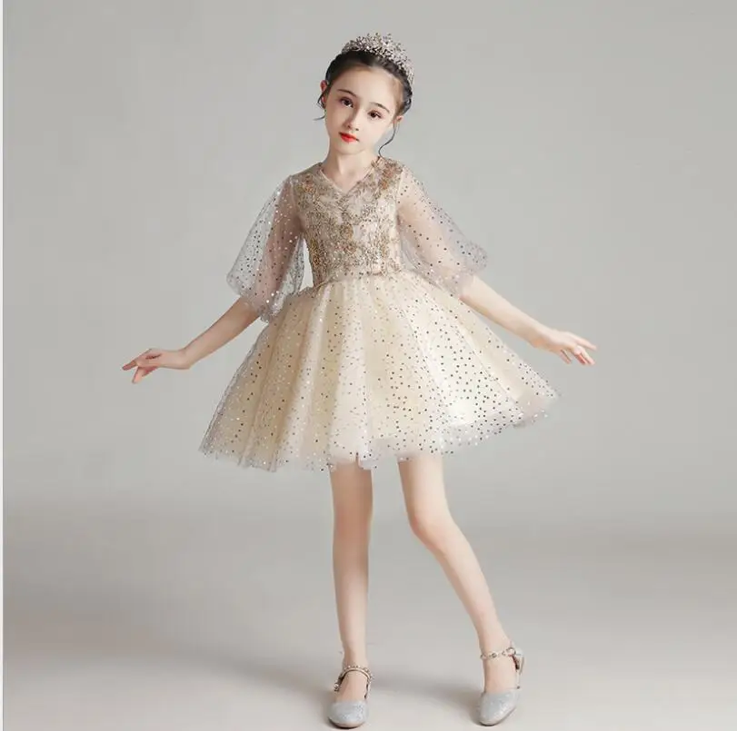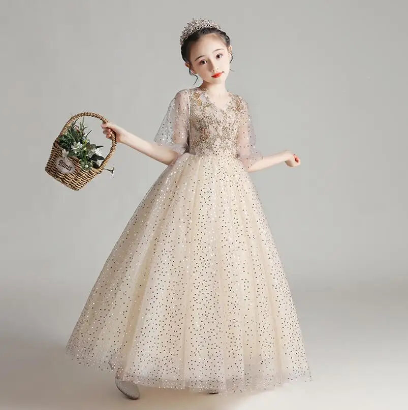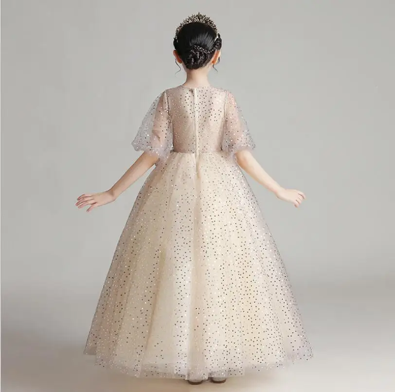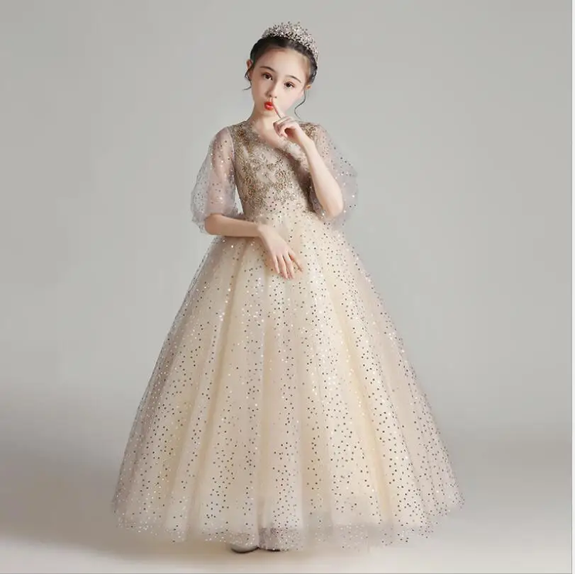 Кружевные торжественные платья с блестками для девочек на свадьбу вечерние платья с коротким рукавом и цветочным узором для девочек детское платье для первого причастия