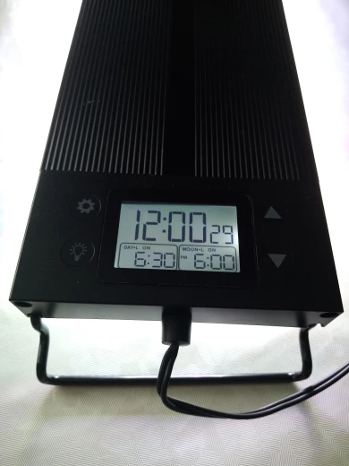 увесистая, металл.можно выставить световой день, единственное я бы сделал рассвет/закат более длительным а не по 1.5 часа и после будет свет на всю катушку, это не естественно, но для этого есть ручная настройка, пишут в инструкции (англ) что для травника это, но с ручными настройками я вроде бы разобрался, но что-то не работает свет согласно таймерам и выставленным диммерам, ещё понаблюдаю за ним, для ручной настройки есть 8 таймеров , где настраиваешь время включения этого самого таймера и выключение , яркость лампы в % шаг 10, т е всего таких таймеров 8 и сутки как бы надо уложить в это количество, что сложно, не получается равномерно и плавно сделать подобно настоящему природному свету, если 100% разделить согласно шагу 10 то как минимум нужно 10 таймеров а точнее 11, т.к нужна ведь ещё ночь где яркость надо выставить 0, и ещё недостаток в том что в ручном режиме нельзя выставить луну после обычного света, где РГБ для растений не помешали бы. выходит программа сырая. а так отлично