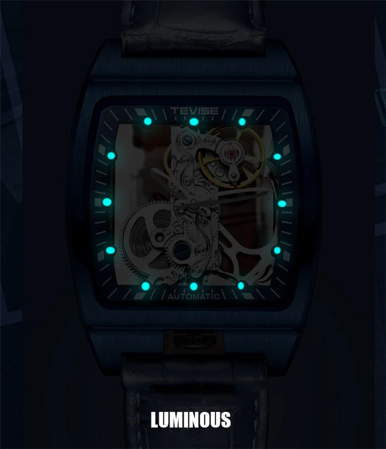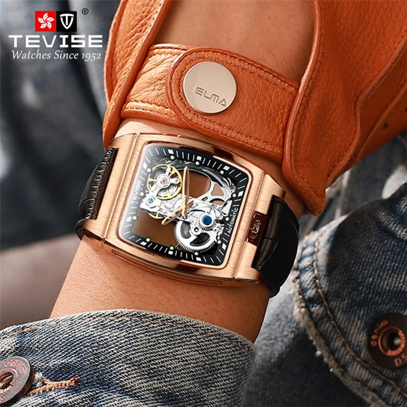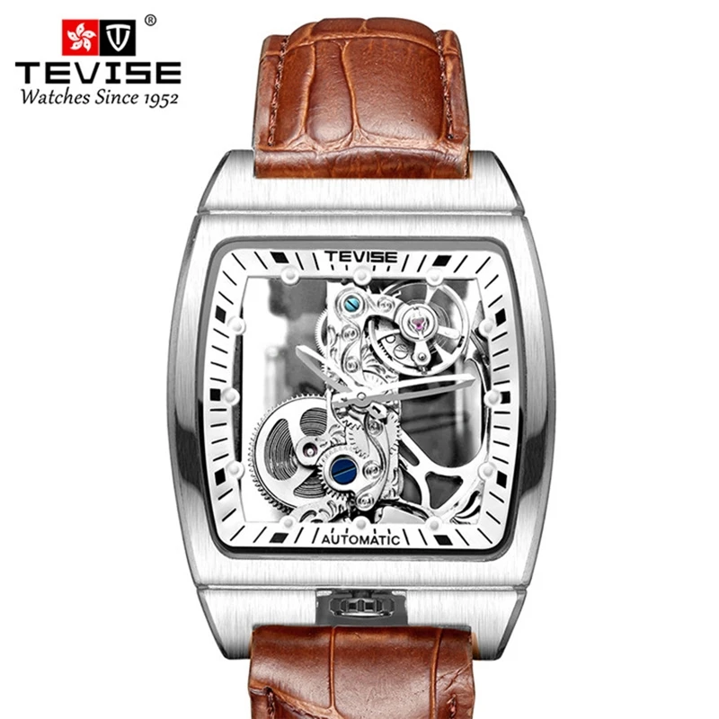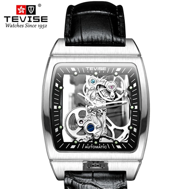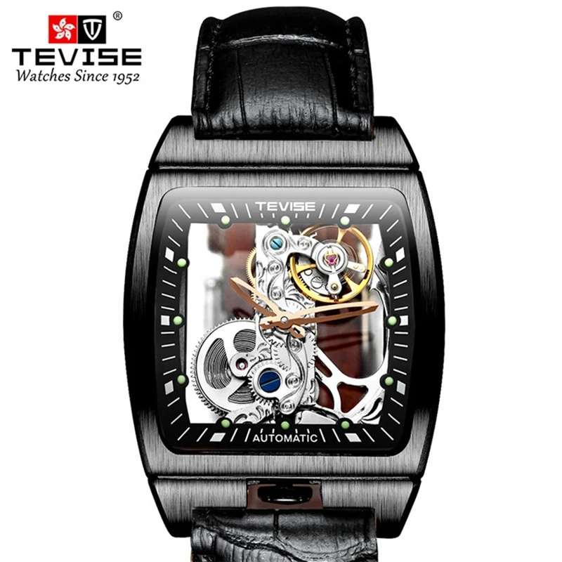 Новые мужские механические часы TEVISE, модные мужские часы с вырезами и кожаным ремешком, светящиеся квадратные популярные мужские часы