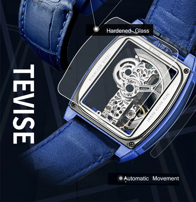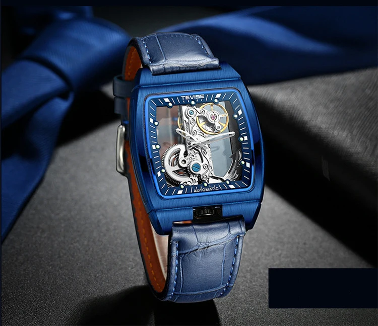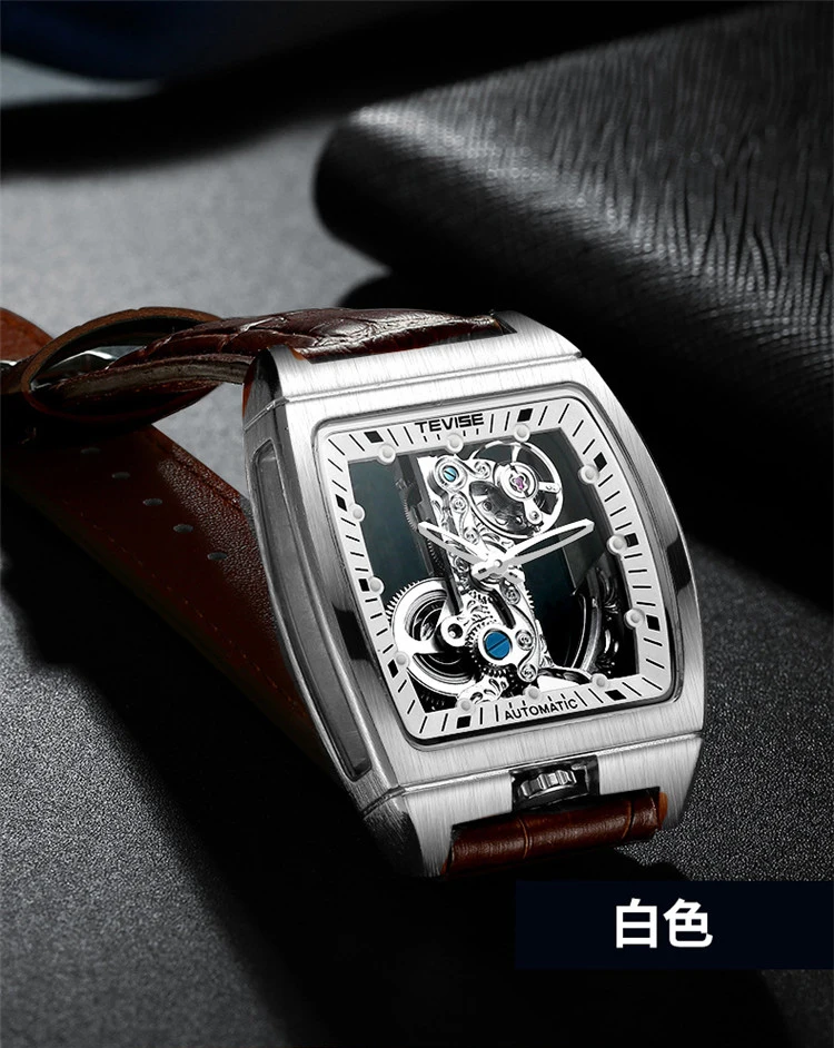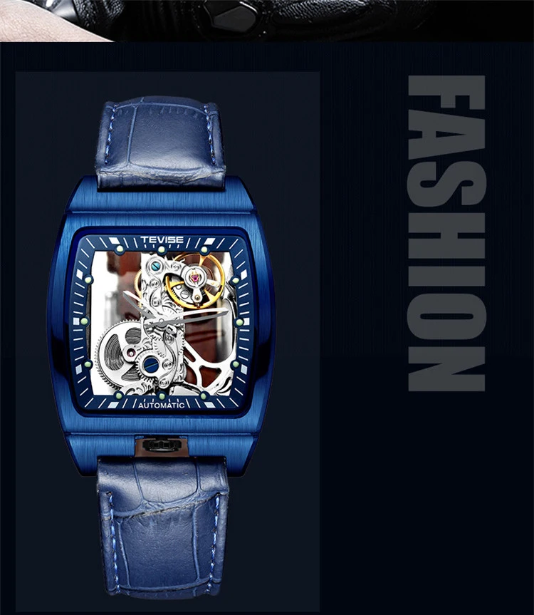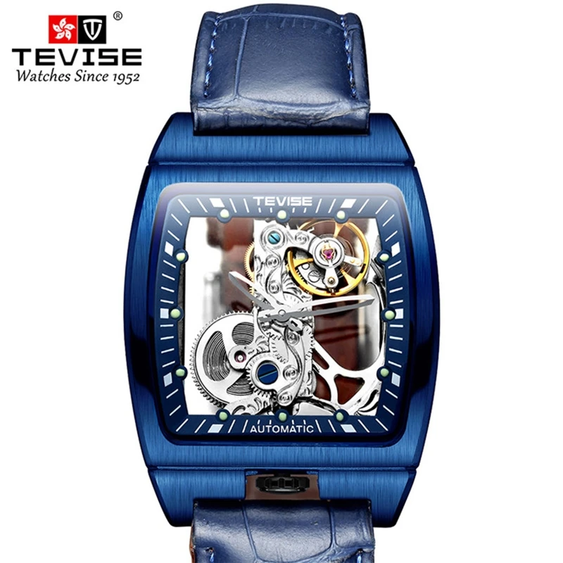 Новые мужские механические часы TEVISE, модные мужские часы с вырезами и кожаным ремешком, светящиеся квадратные популярные мужские часы