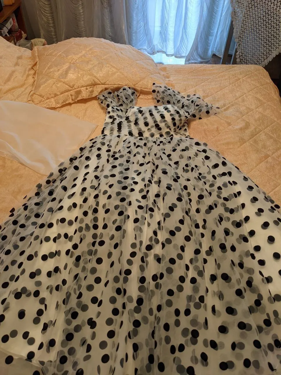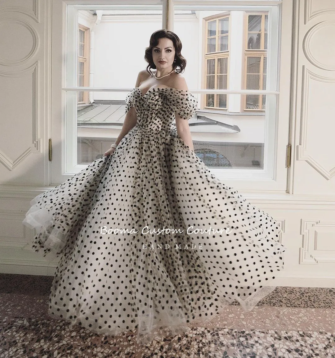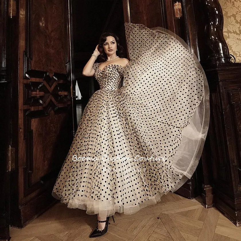 Бальное платье в горошек, из тюля, с открытыми плечами, до щиколотки
