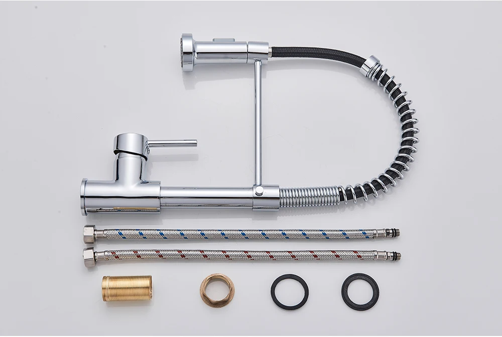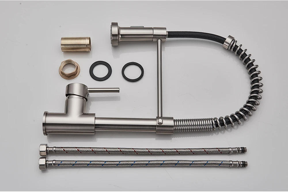 Описание смесителя Функция: кухонный кран для раковины Тип клапана: Керамический клапан Материал корпуса смесителя: латунь Материал ручки смесителя: латунь Материал головки распылителя: АБС-пластик С 2 трубами для холодной и горячей воды Матовый черный кухонный кран смеситель 360 градусов вращение потока распылитель сопло горячий холодный кран