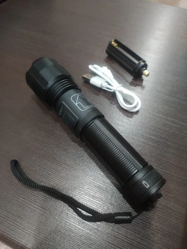 Товар пришёл быстро. Состояние рабочее, светит ярко. Есть несколько режимов. В комплекте адаптер на 3 батарейки ААА, провод для зарядки, можно поставить аккумулятор 18650 не больше