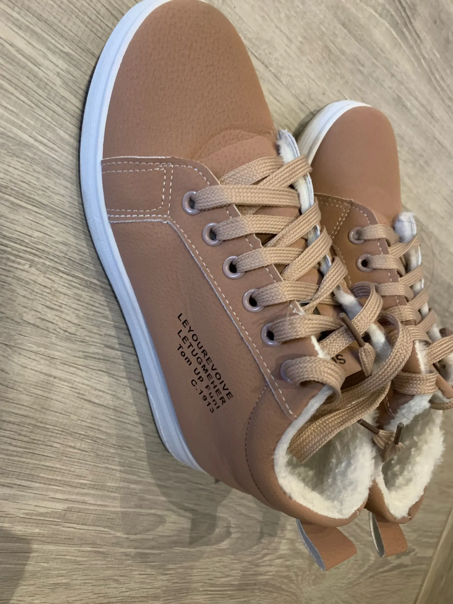 Совершенно не соответствует картинке...Но с размером угадала... Нет меховой опушки вокруг ботинка. На рисункие ботинки как замшевые, а на самом деле кожзам. Задняя часть подошвы на картинке имеет чёрную вставку, а на тех, которые пришли мне, вставки нет. Ботинки мятые, материал из которого они изготовлены заломлен.На пятке должен быть высокий запятник, его тоже нет.