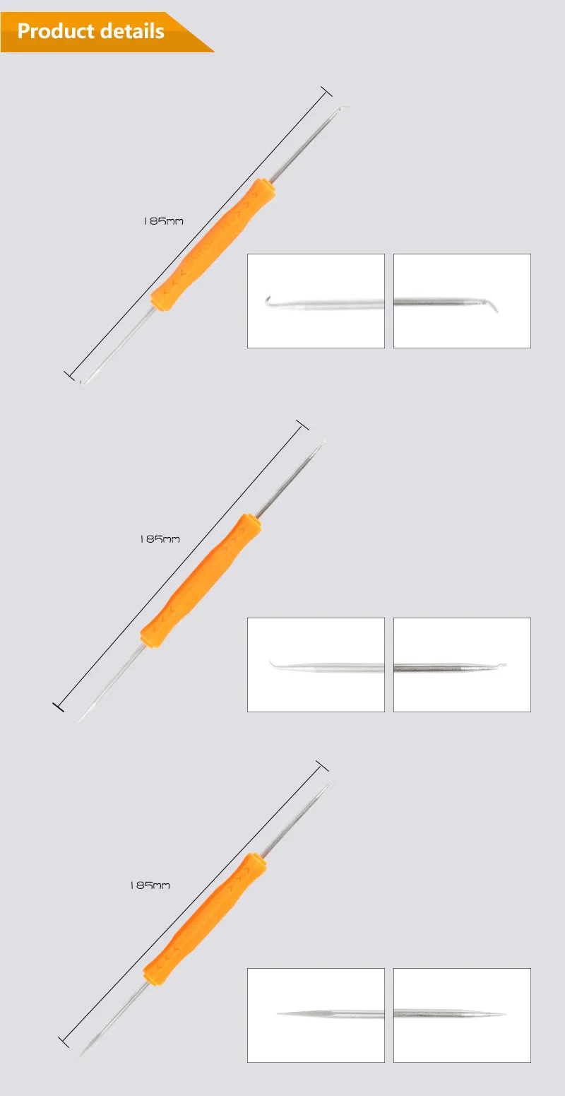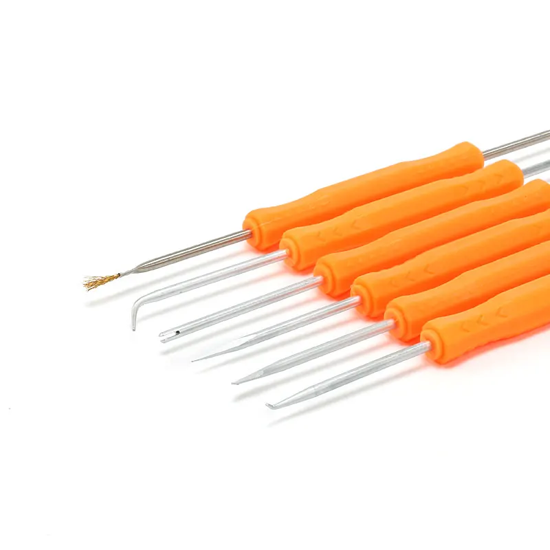 1 изогнутый тип иглы: Отрегулируйте шпильки монтажного IC, PICC и т. д. 2 типа крючка: зацепите провода и провода компонента 3 типа вилки: штифт или кабель для фиксации или регулировки компонентов 4 типа скребка: резка проводки печатных плат 5 Awl Тип: очистить и расширить отверстия в доске 6 тип кисти: очистка пыли и остатков от паяльных деталей перед пайкой