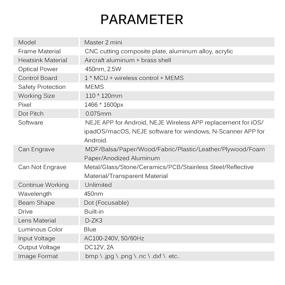 Ключевой особенностью мини-лазерного гравера Master 2 является быстрая скорость гравировки, в два раза быстрее, чем Мастер 7 Вт 2. С большим диапазоном гравировки 110*120 мм гравер может гравировать на таких материалах, как МДФ/балса/бумага/дерево/ткань/пластик/кожа/Фанера/пенная бумага/анодированный алюминий. Кроме того, он поддерживает 360 ° гравировки, что означает, что он может произвольный трехмерной гравировки на двери или стеновой панели. Особенности: Более удобное и быстрое: беспроводное управление в режиме off-line и APP, гравировка на 360 °, высокая скорость, экономия времени. Облачная галерея и онлайн Gcode упрощают создание. Поддержка гравировки на 360 °: может быть произвольной трехмерной гравировки на двери или стеновой панели. Безопасен в использовании: Встроенный MEMS датчик защиты, при случайном прикосновении, машина автоматически прекратит работу. Высокая эффективность: 42 мм Большой привод шагового двигателя светильник-вес дизайн модуль, быстрая скорость гравировки обеспечивает эффективность работы. Резной Материал: может вырезать МДФ, бальзу, бумагу, дерево, ткань, пластик, кожу, фанеру, Пенную бумагу, анодированный алюминий и т. д. (не подходит для железа или другого металла) Характеристики: Модель: Master 2 mini Материал оправы: композитная пластина для резки с ЧПУ, алюминиевый сплав, акрил Материал радиатора: авиационный алюминий + латунный корпус Оптическая мощность: 450нм, 2,5 Вт Плата управления: 1 * MCU + Беспроводное управление + EMS Защита безопасности: MEMS Рабочий размер: 110*120 мм Пиксель: 1466 * 1600px Точка шаг: 0,075 мм Обслуживание обновления программного обеспечения NEJE: Да NEJE облачная Галерея: Да Функция сканера NEJE: Да Гравировка: МДФ/балса/бумага/дерево/ткань/пластик/кожа/Фанера/пенная бумага/анодированный алюминий Не выгравировать: металл/стекло/камень/керамика/PCB/нержавеющая сталь/светоотражающий материал/прозрачный материал Продолжить работу: неограниченный Длина волны: 450нм Форма луча: точка (фокусируемая) Привод: Встроенный Материал линз: D-ZK3 Светящийся цвет: синий Вход Напряжение: AC100-240V В переменного тока, 50/60 Гц Выходное напряжение: DC12V, 2A Формат изображения:. Bmp \. Jpg \. Png \. Nc \. Dxf и т. Д. Размер изделия: 1*1 * мм/1*1 * в Вес гравера: 968 г/34,15 унций Вес посылка: 1470 г/51,85 унций Посылка Размеры: 32*27*14,5 см/12,60*10,63 * 5.71in Упаковочный лист: 1 * гравер 1 * очки 1 * кабель включения/выключения 1 * USB кабель 1 * 12V2A адаптер питания 1 * Мини l-образный ключ 1 * деревянный блок 1 * стеклянная Фокусирующая пластина 2 * лист тестовой бумаги 1 * Руководство (EN, DE, IT, FR, ES, RU, KR, JP, AR, CN) Примечание (Пожалуйста, обратите внимание): 1. Пожалуйста, носите лазерные очки во время использования и избегайте касания лазера непосредственно глазами и кожей! 2. Не выгравировать зеркальные предметы. Не может выгравировать металл/стекло/камень/керамика/PCB/нержавеющая сталь/светоотражающий материал/прозрачный материал. 3. Дым будет генерироваться при сжигании, пожалуйста, обратите внимание на дым выхлопной в помещении. 4. Обратите внимание на огонь. 6. Обратите внимание на домашних животных при работе.
