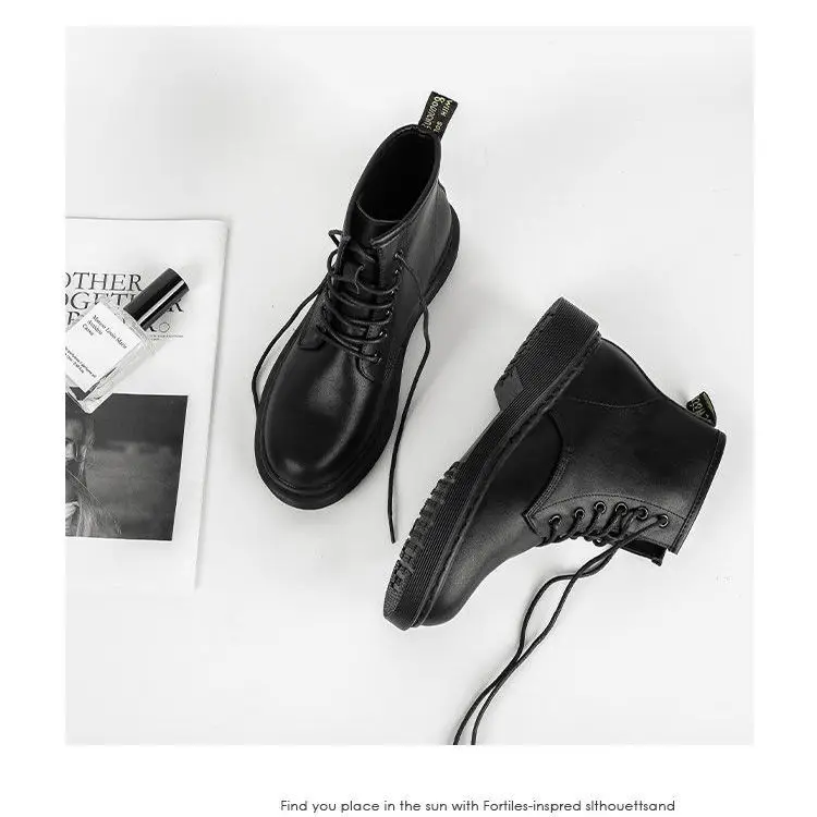 Черные полусапожки с шестью отверстиями; Женские осенние полусапожки на плоской подошве в британском стиле; Новинка 2021 года; Женские мотоботы из искусственной кожи