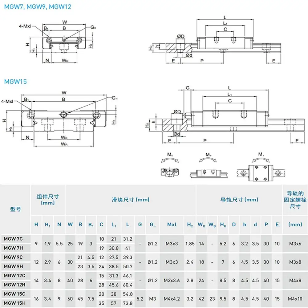 Направляющая Ширина или ДиаметрMGW7 MGW12 MGW9 MGW15