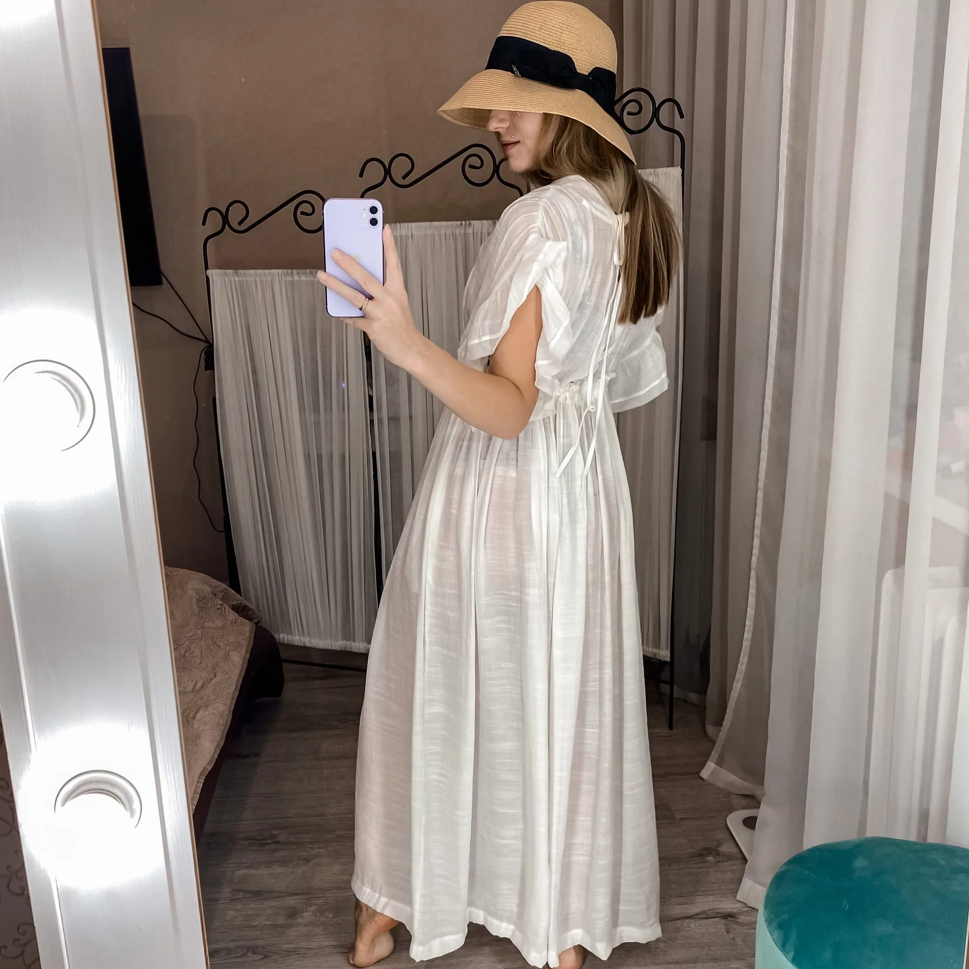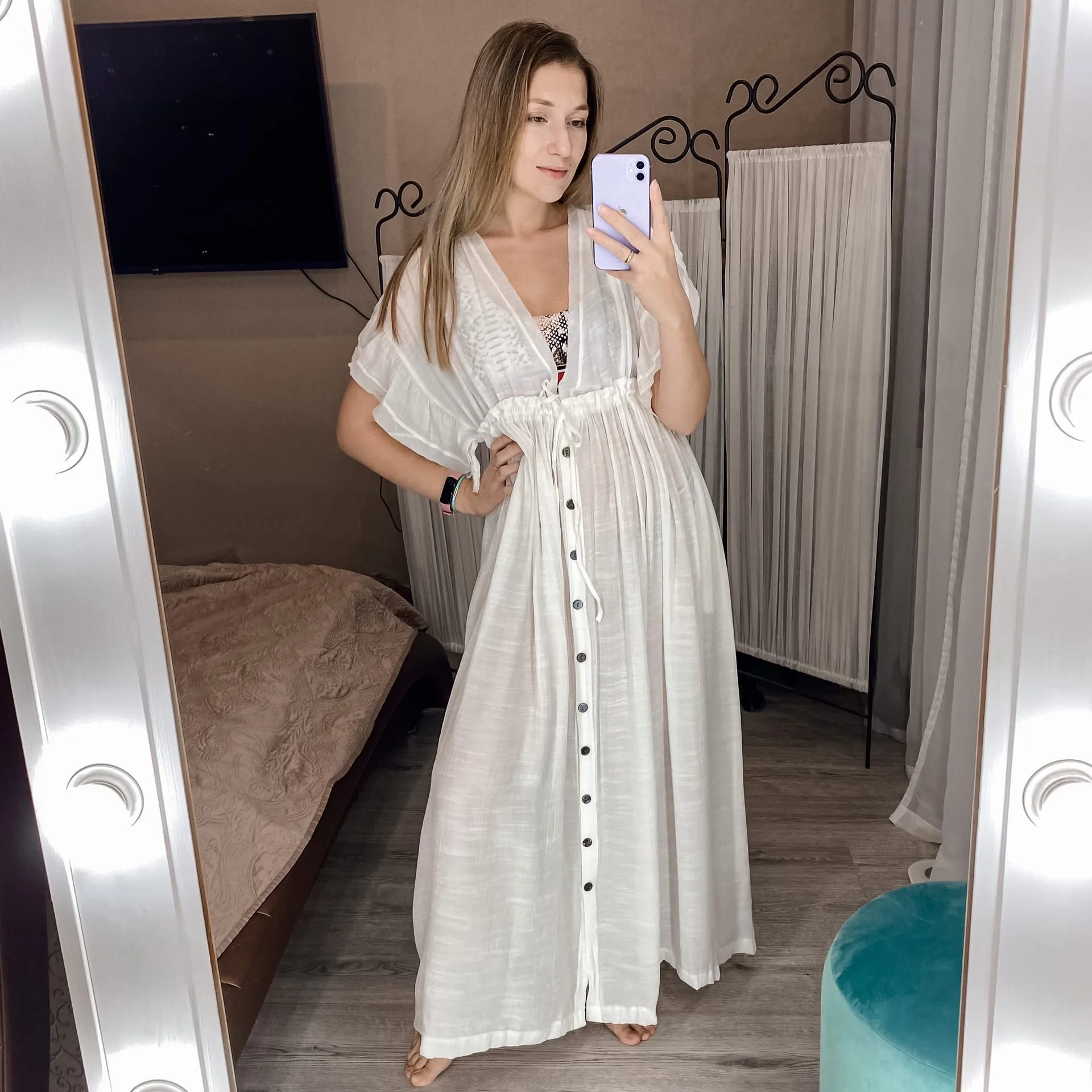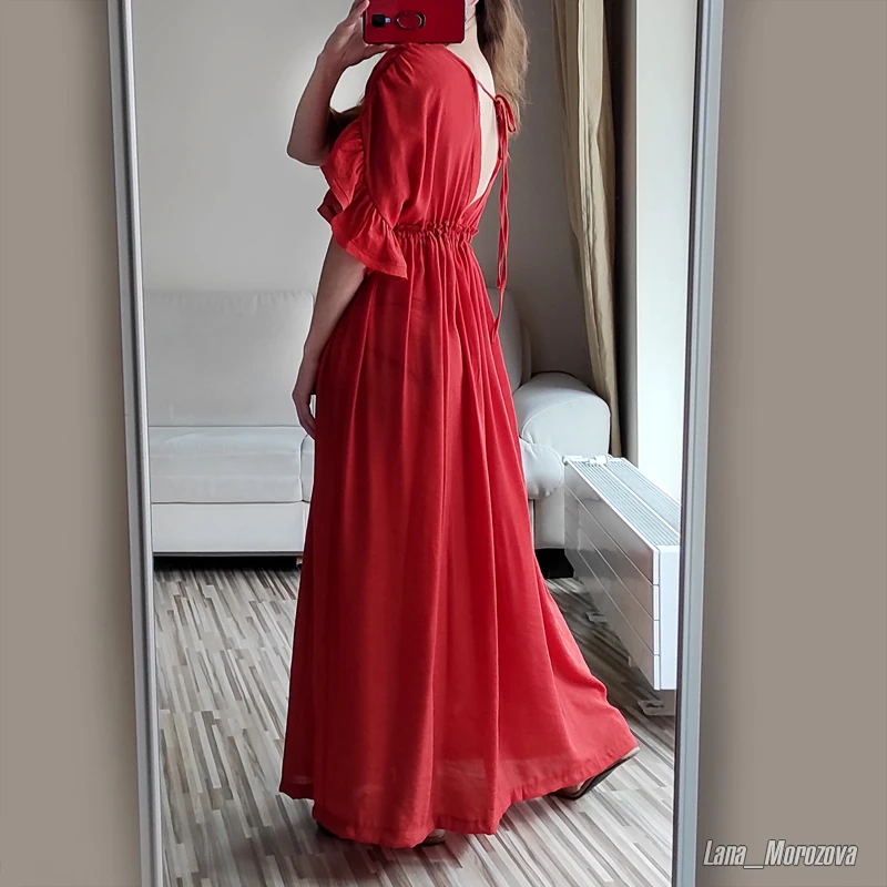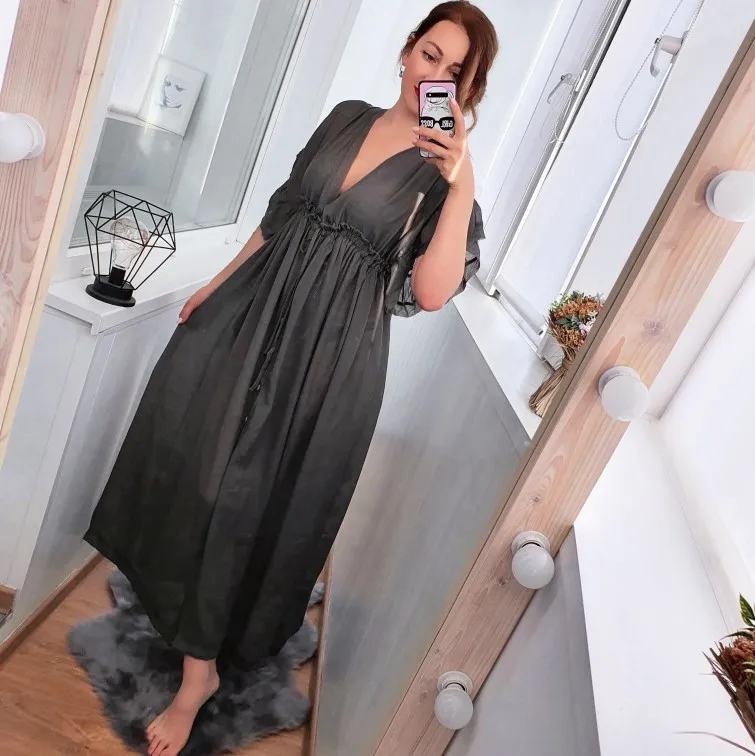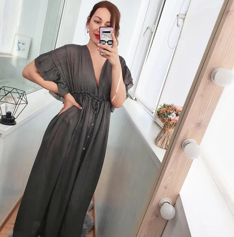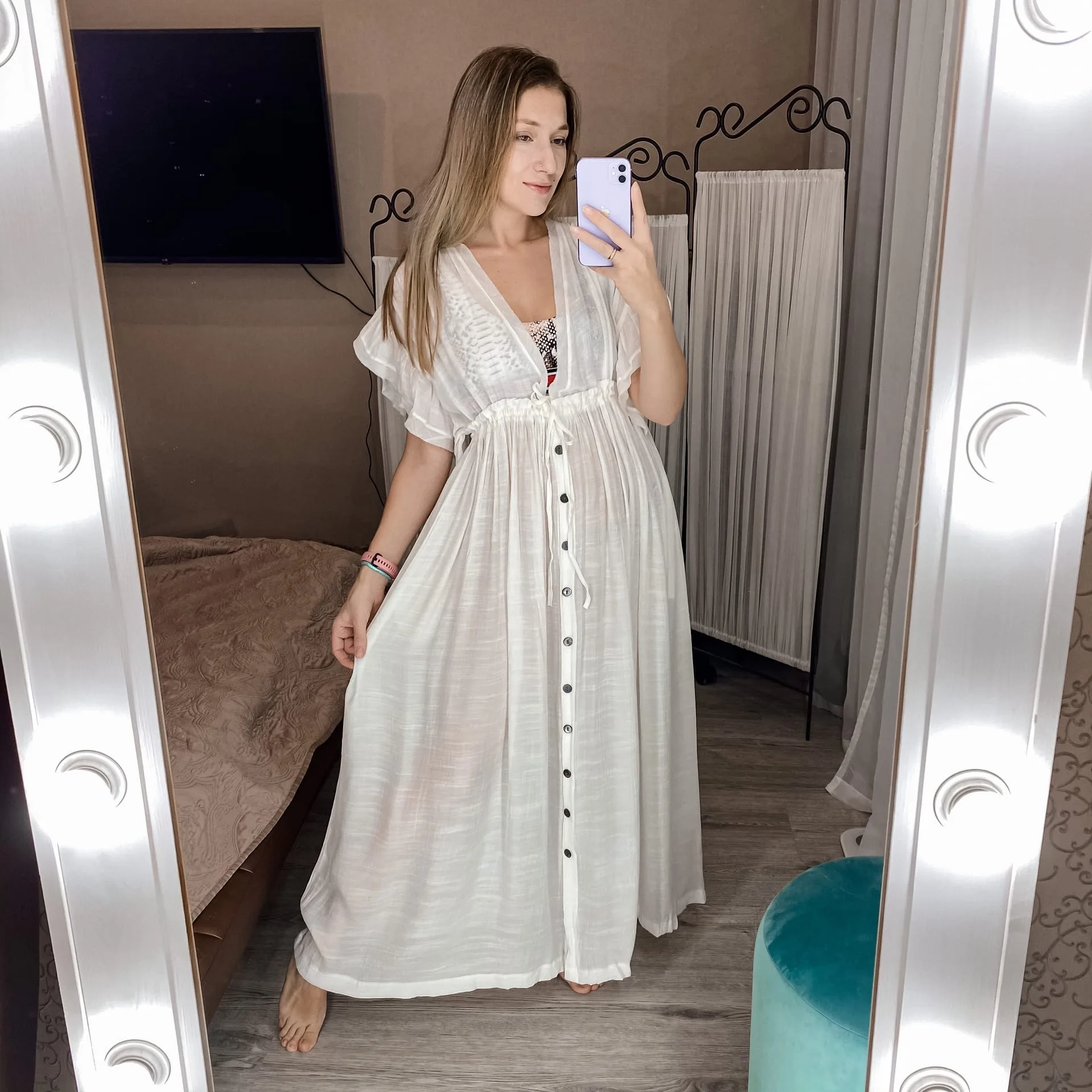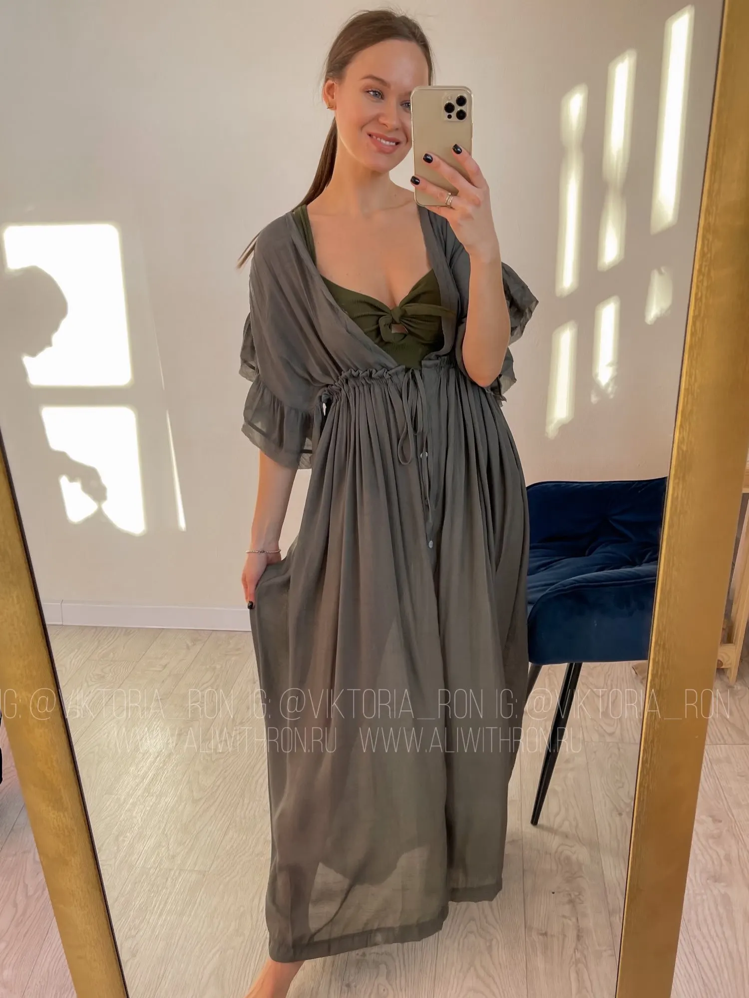 Пляжное платье которое не хочется снимать ♥ Регулируется завязками под грудью, подойдет от 40 до 50 размера. Материал указан полиэстер, но ткань очень легкая, воздушная, приятная к коже. Будет хорошо пропускать воздух в жару. Я бы это синтетикой не назвала, по тактильным ощущениям. Есть карманы по бокам, также юбка застегивается на пуговицы. Спинка с V- образным вырезом. Рукава очень красивые, это изюминка этого платья. Не сказала бы что оно очень сильно просвечивает. На рост 171 см длина почти до пят. Мои параметры 84-77-93. Платье к покупке советую, оно достойное!