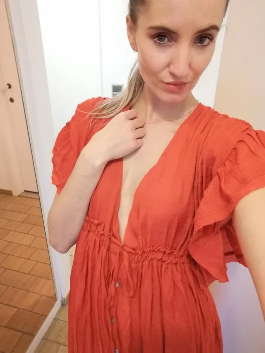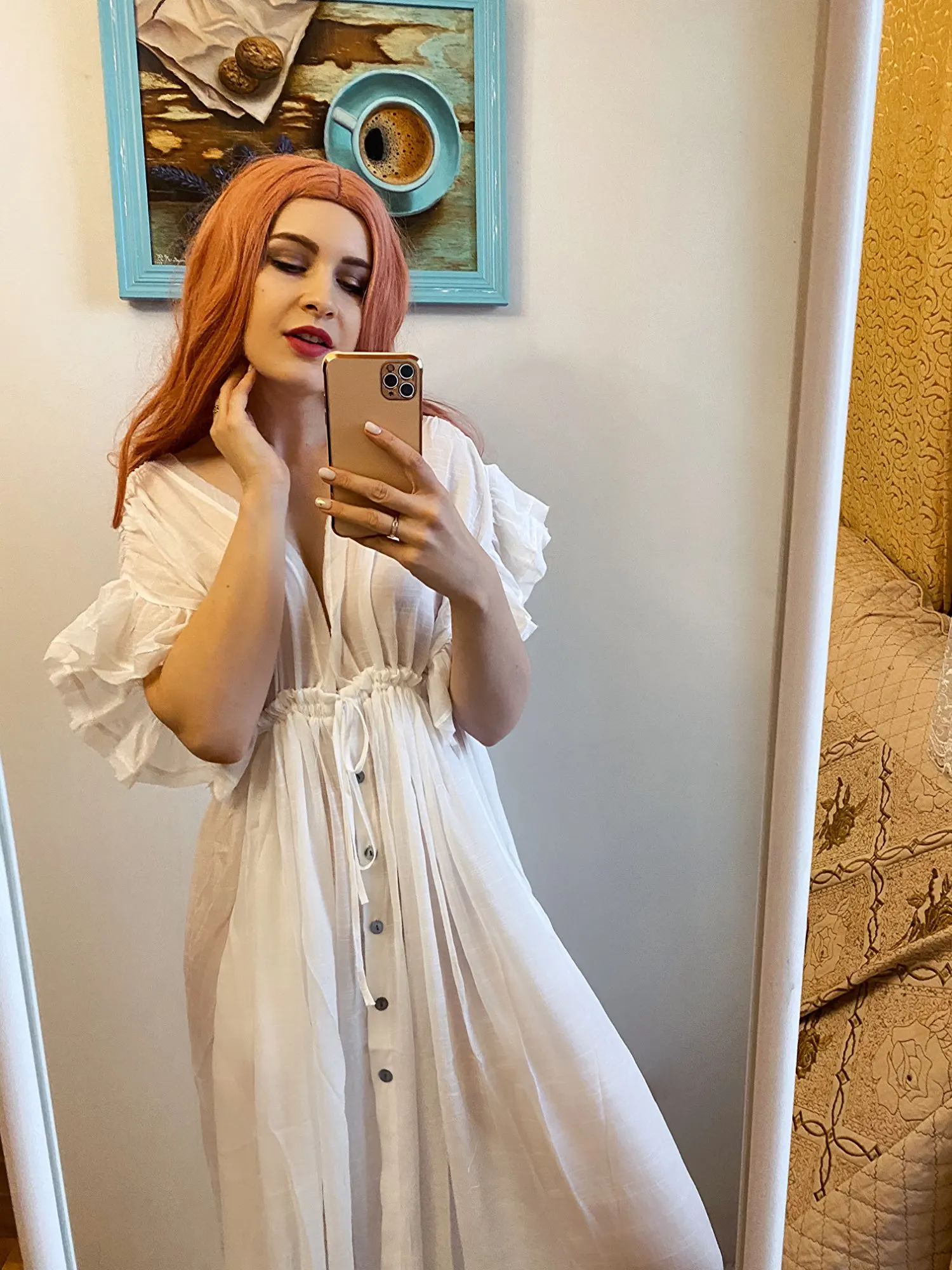 Доставка была быстрой, упаковка – подобающей, потому платье приехало без каких-либо негативных нюансов. Мой оттенок просвечивает лишь слегка. Ткань не хлопковая, но комфортная и для лета подходящая, тем более что и модель такая вся воздушная. Мои нынешние параметры – 86-67-94, рост в 162 см. Посадку вы видите – длина с запасом, по объемам запас есть. По полочке и по спинке одинаково глубокие вырезы, но по спинке имеются завязки, не позволяющие платье сползать с плеч. Талия на кулиске, от которой вниз спускается ряд пуговок с жемчужными переливами. По бокам вшиты карманы! Качество пошива всего этого в целом в норме. Платье прекрасное! Модель воздушная, она с любого ракурса выглядит чудесно и представляет фигуру в лучшем виде, пряча недостатки и акцентируя внимание на достоинствах.