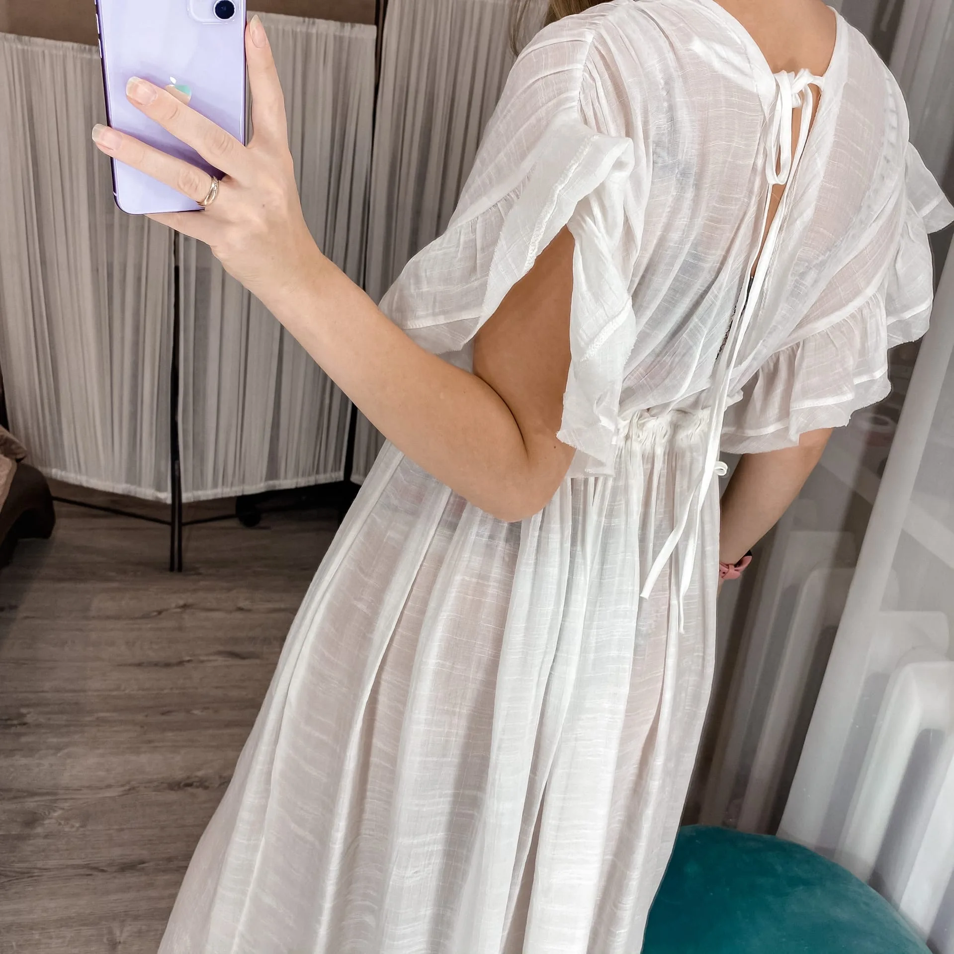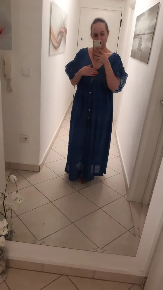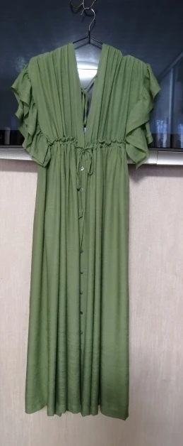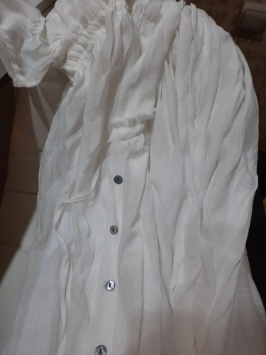 Доставка 2.5 недели. На параметры 85-70-90 подошло, за счет регулировки подойдет на 42-50 размеры (а может и больше). Изделие выполнено из тонкой ткани. Та умеренно просвечивает. Легкая, воздушная, думаю в такой не будет жарко. На талии регулировка с помощью шнурков. Вырез треугольный. Далее спереди ряд пуговок, все расстегиваются. По бокам есть карманы. На спинке завязки, чтобы верх не слетал. Рукава короткие, с оборкой. Платье смотрится очень интересно. В нем легко и комфортно. Как по мне, светлое всегда выглядит нарядно. На мой рост длина до пят. Качество хорошее. Ну есть несколько ниточек, но как по мне - это ерунда. Платье мне понравилось. Модель интересная. Стоимость адекватная.