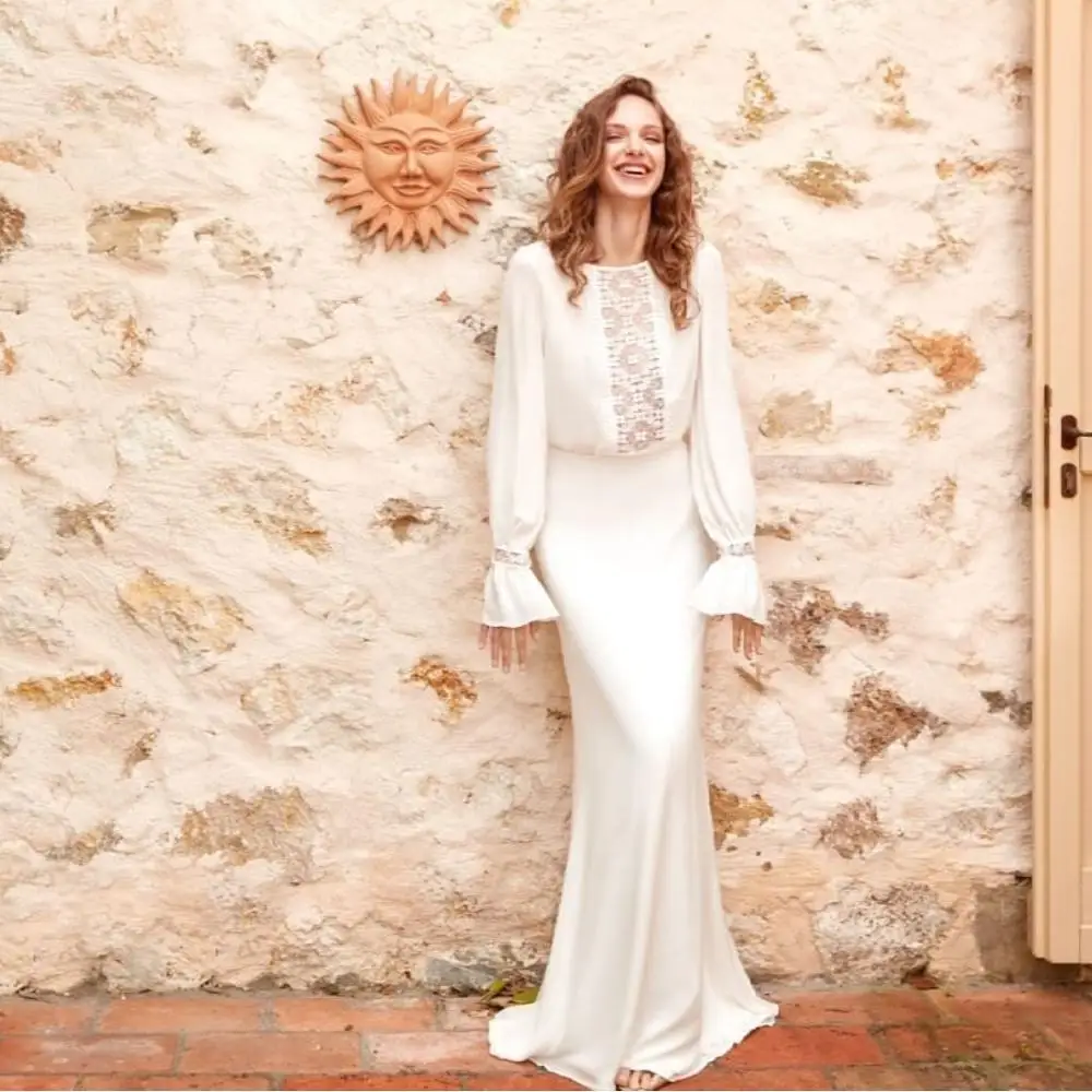 Женское атласное свадебное платье, элегантное облегающее платье до пола с длинным рукавом и шлейфом, элегантное белое платье невесты, 2021