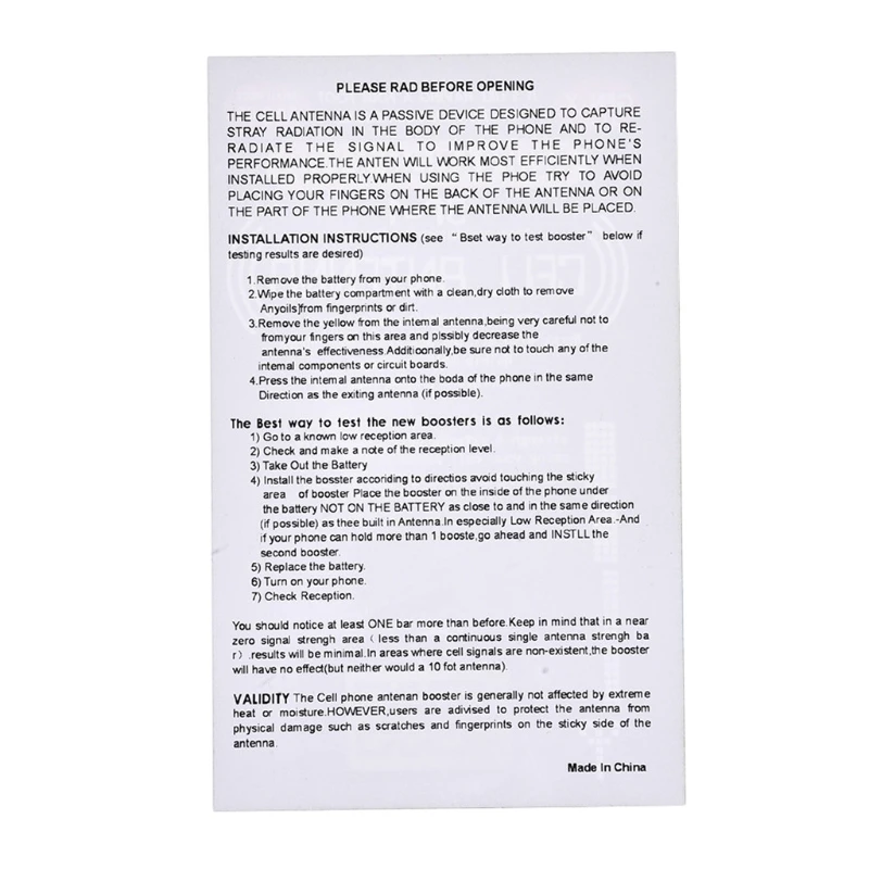 Откройте заднюю крышку мобильного телефона, выньте батареи и протрите Место вставки наклейки сигнала. Затем слегка Оторвите усилитель сигнала от блистерной карты и вставьте его хорошо с помощью «вверх» выравнивания с антенна сотового телефона. Получите обратно аккумуляторы и крышку, затем включите питание.