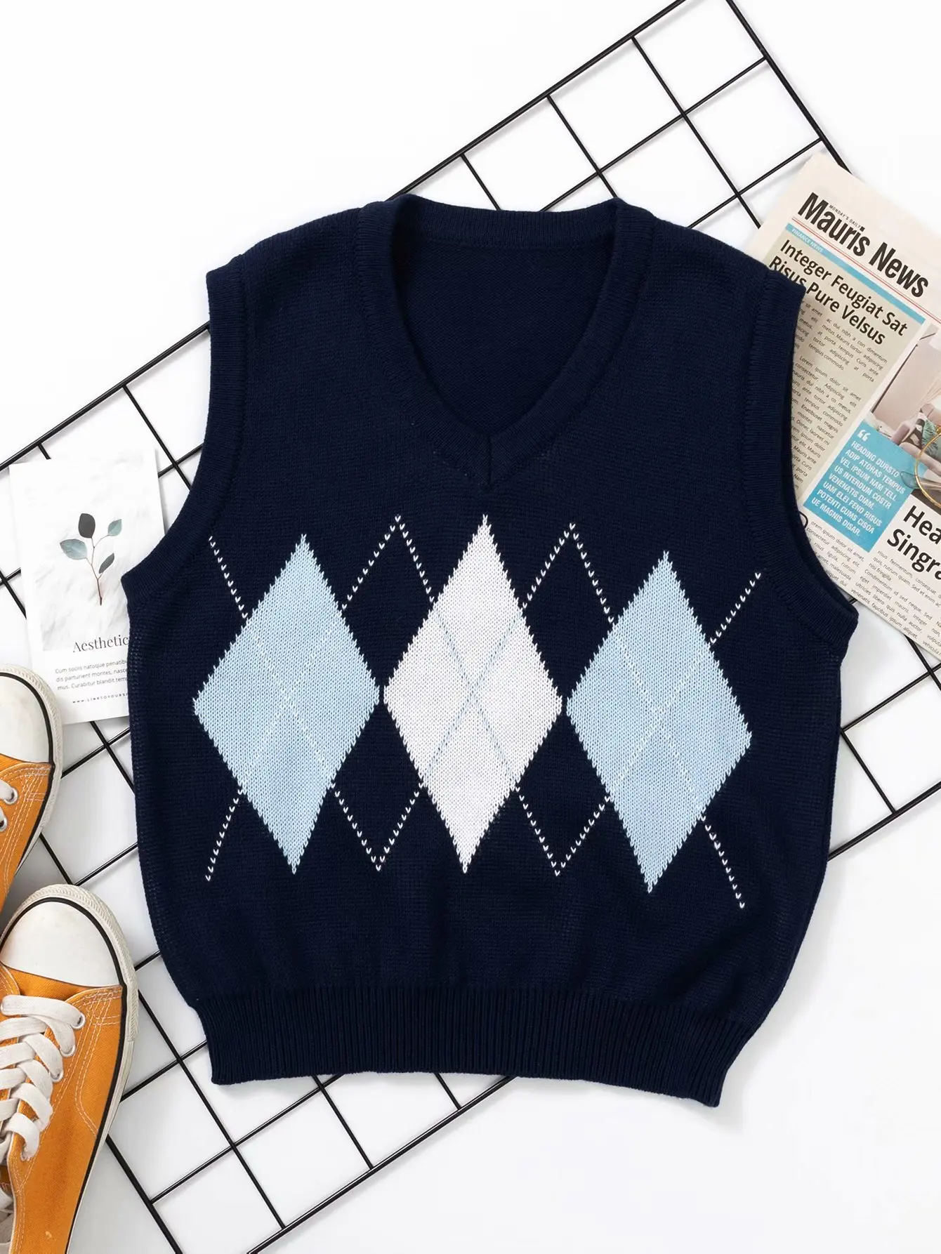 Женский короткий вязаный жилет Argyle, винтажный вязаный жилет в клетку, розовый осенний свитер в Корейском стиле