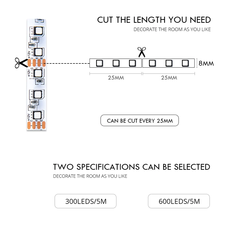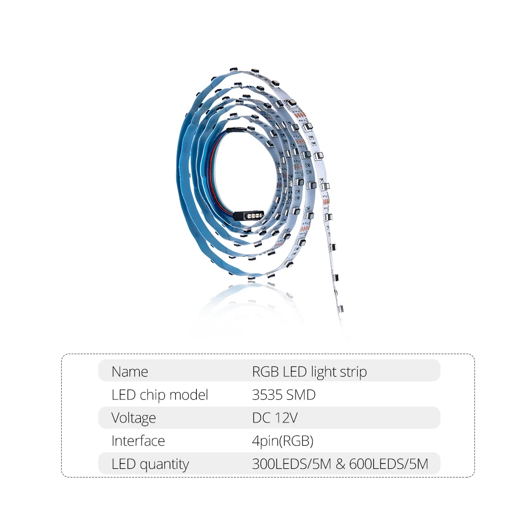Спецификация: Тип: Светодиодная лента 3535 RGB Уровень водонепроницаемости: IP20 не водонепроницаемый Полоса Длина: 0,5 м 1 м 1,5 м 2 м 3 м 4 м 5 м Количество светодиодов: 60 светодиодов/м 120 светодиодов/м Печатная плата: белый/черный Напряжение: 12 В постоянного тока Интерфейс: 4pin Цвет излучения: RGB многоцветный Угол луча: 120 градусов Температура хранения. : -40 - 80 градусов Цельсия Рабочая температура. : -25 - 60 градусов Цельсия Применение: гостиная, спальня, ТВ ПОДСВЕТКА/мотал/магазин/к ТВ, бар, игровая комната Простая установка: 1. Вырезать (по мере необходимости): вырезать на отметках на полоске до желаемой длины. 2. Очистка: Удалите клейкую подложку на ленте.