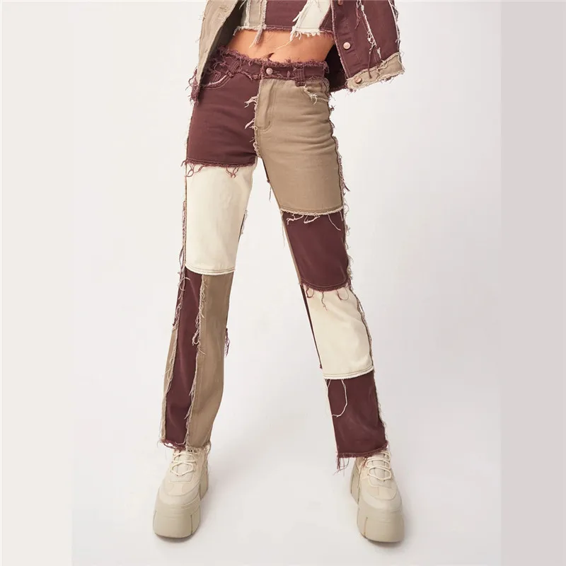 2021 новые модные Осенние Синиерозовые джинсы в стиле пэчворк, женские прямые джинсы с высокой талией в стиле хип-хоп, женские брюки, женские джинсы для женщин