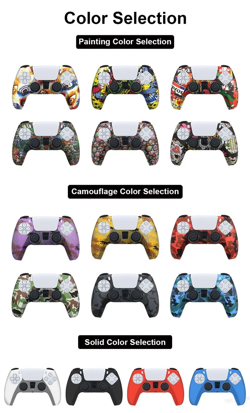 Полностью покрытая силиконовая кожа защищает каждый уголок вашего контроллера, избегайте грязи, пыли, царапин, падения ударов, чтобы повредить контроллерСиликоновое трение обеспечивает удобный захват, предотвращает скольжение во время игры, больше не беспокойтесь о потных руках;Очень легко устанавливается и снимается, идеально подходит для контроллера PS5, не влияет на любую функцию;Технология печати воды камуфляж на PS5 контроллер, более модный вид;