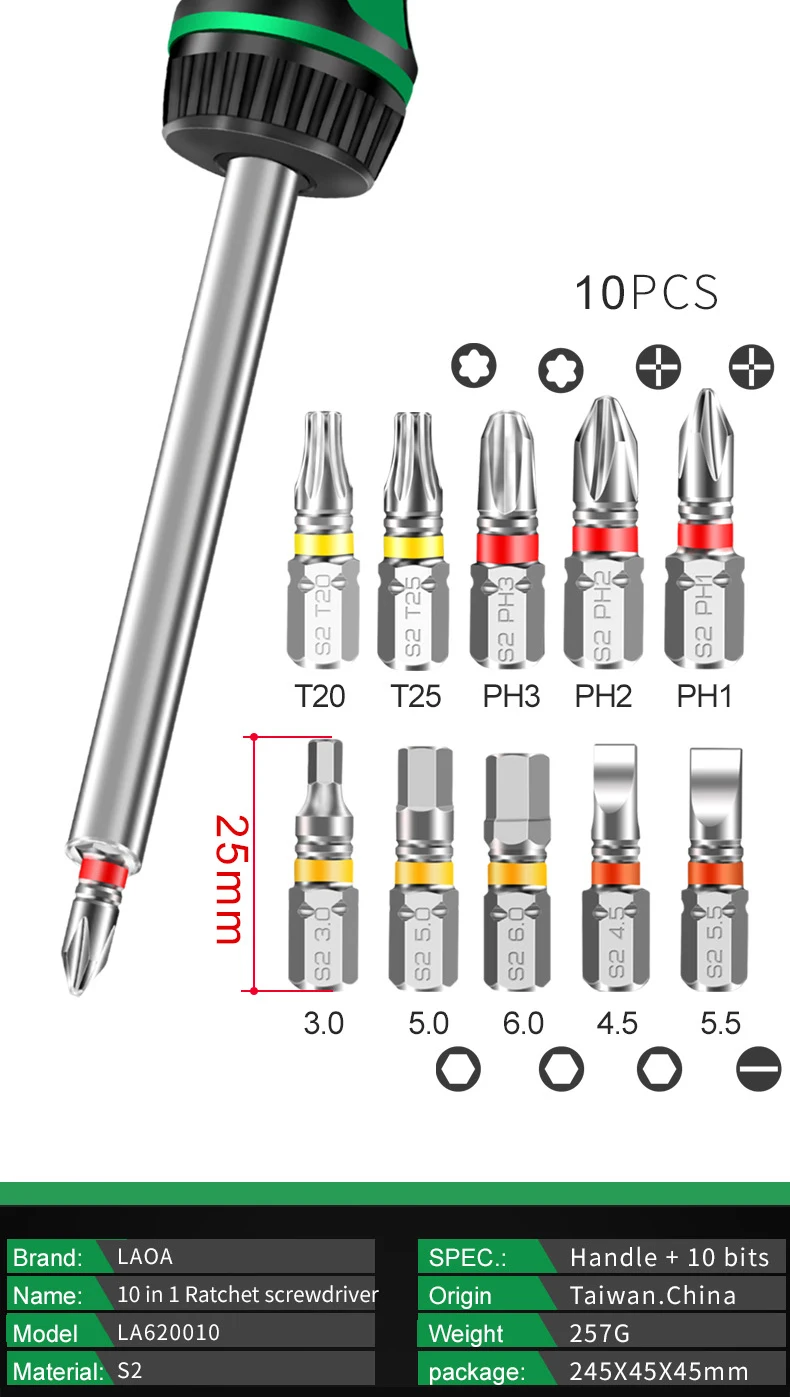 LAOA 10 в 1 трещотка Набор отверток 10 шт. S2 Phillips щелевые Torx биты с шестигранной отверткой 48T 20N.m алюминиевый набор инструментов