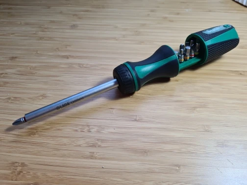 Отвертка большая, тяжелая, с небольшим люфтом и скрипом. На конце магнит для бит. Есть трещотка на три положения.