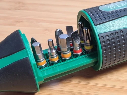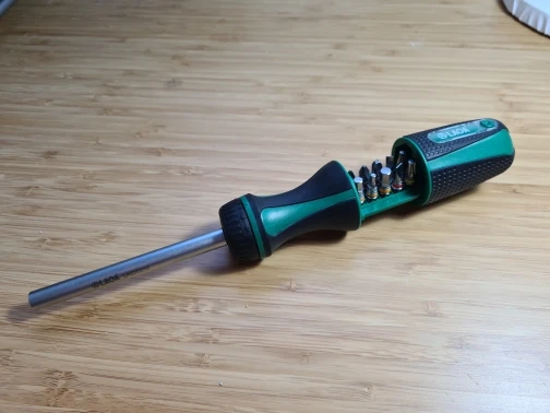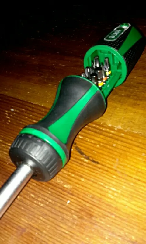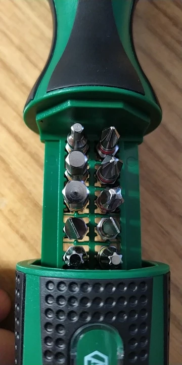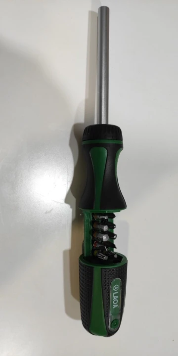 Прежде чем пользоваться пришлось разобрать и смазать трещетку, отвратительно работал переключатель. Биты одноразовые из мягкого металла. Из плюсов - жало не люфтит, рукоятка толстая прорезиненная. Толщина пластика рукоятки в самых тонких местах 2,5 мм, насколько сильно можно крутить - вопрос. Думаю таких денег не стоит.