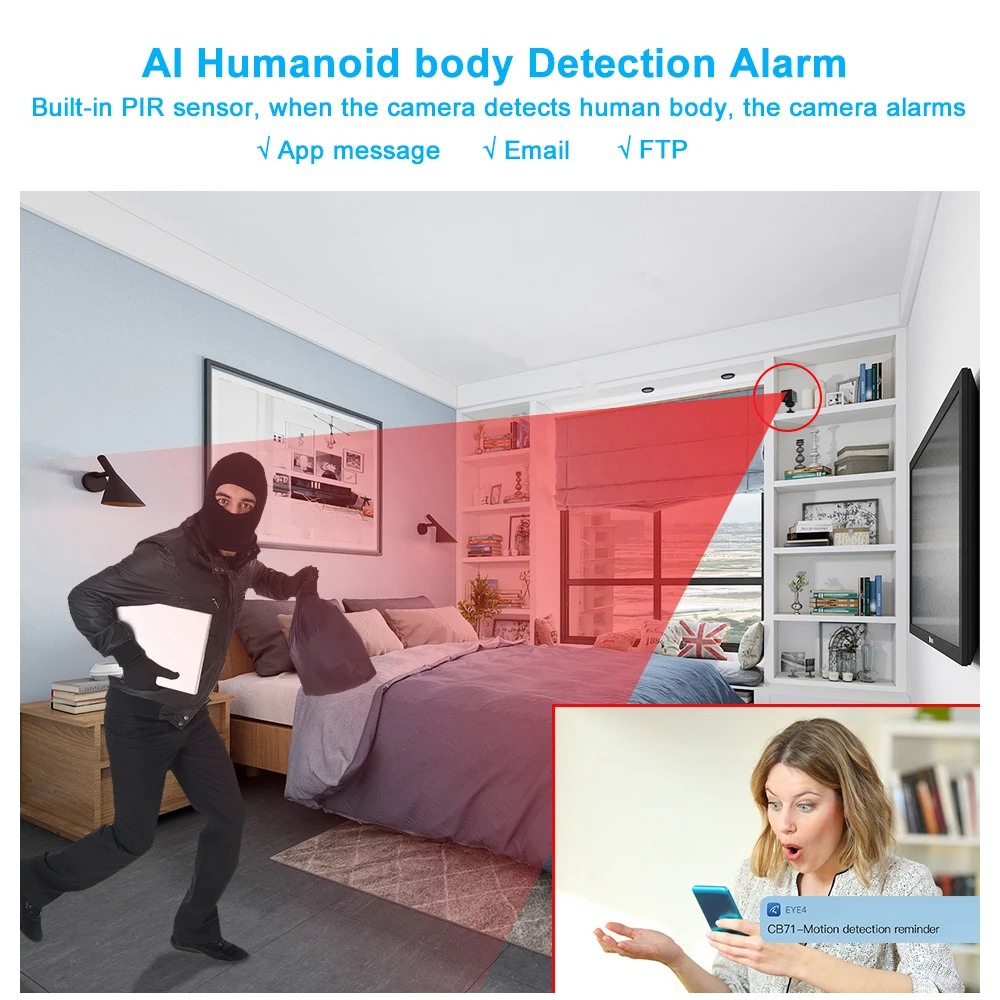 √ Встроенный инфракрасный датчик человека, как только камера обнаружит инфракрасное излучение человеческого тела, камера генерирует электрический сигнал, электрический сигнал срабатывает сигнал тревоги, сигнал тревоги отправит вам push-сообщение APP, FTP и электронные письма. √ Инфракрасное Обнаружение человека PIR может эффективно фильтровать недействительные сигналы тревоги, такие как развевающийся занавес, вызванный легким ветерком, только сигнал тревоги, когда камера обнаруживает человеческое тело. √ Три способа оповещения: push-сообщение приложения, уведомления по FTP и электронной почте.