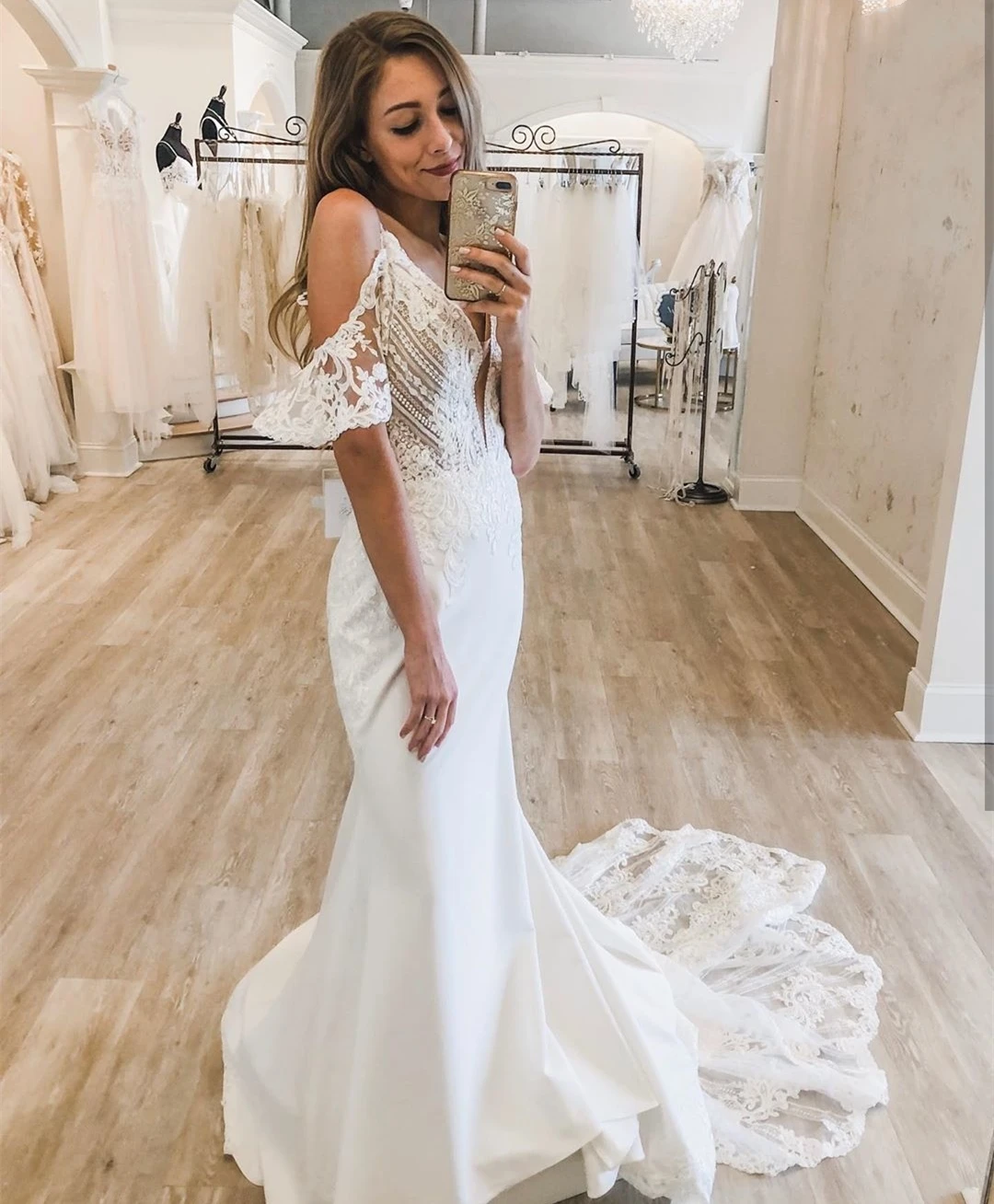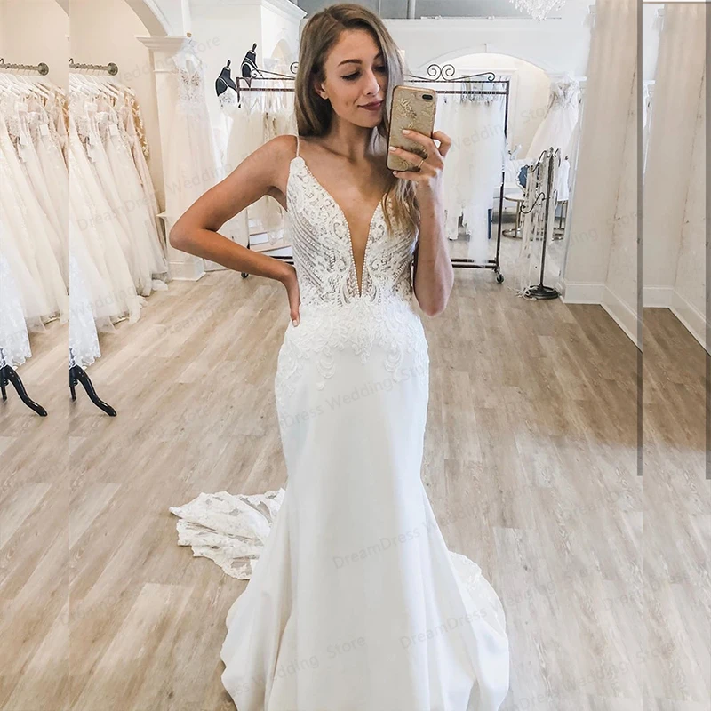 Женское свадебное платье с юбкой-годе, белое атласное платье с глубоким V-образным вырезом, со шлейфом без рукавов, на бретелях-спагетти, на заказ