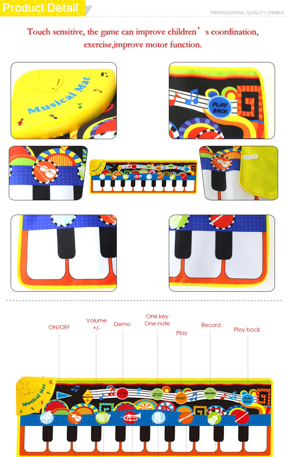 Развивайте детский темпераментДетям необходимо прикоснуться ногамиМилый ключ пианиноЦветная светильник ПышкаРазличные узоры инструментов имеют разный звук (фортепиано, скрипка, аккордеон, стук пианино, гудок, гитара, флейта, ... )Музыка и голос ковра могут стимулировать способность бабая к логикеУлучшите наблюдение за ребенком. Вы можете посмотреть наше видео, чтобы узнать больше об этом.