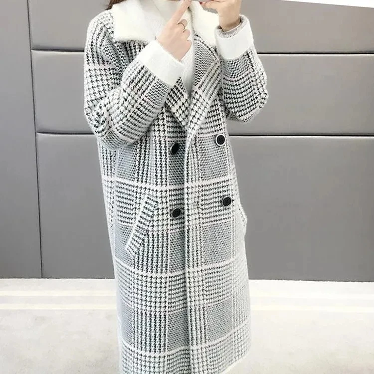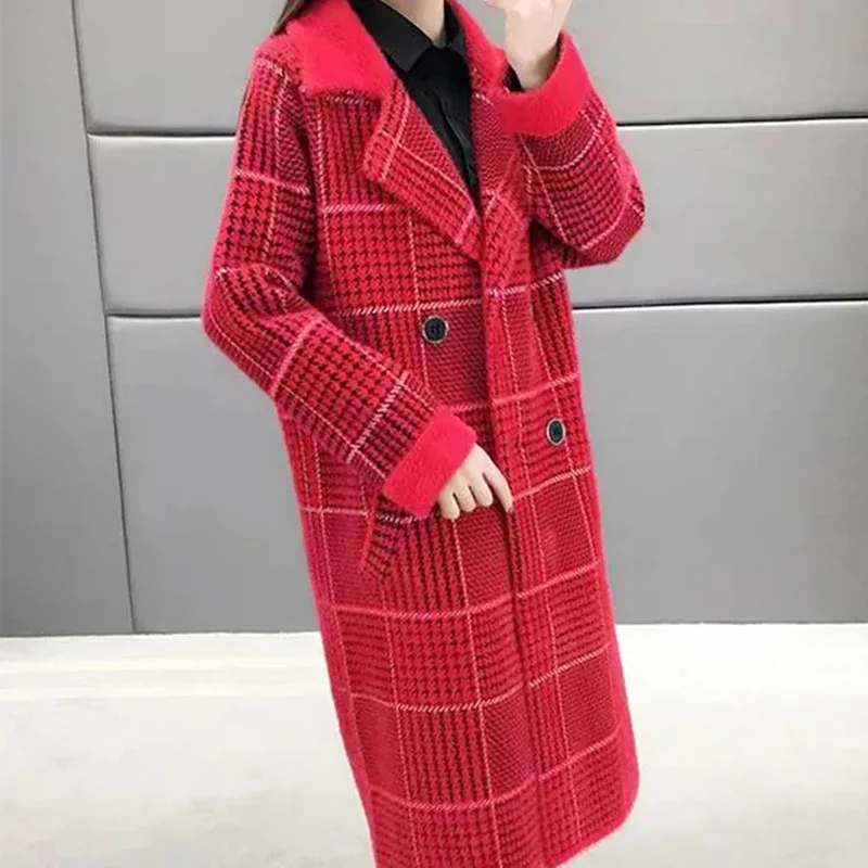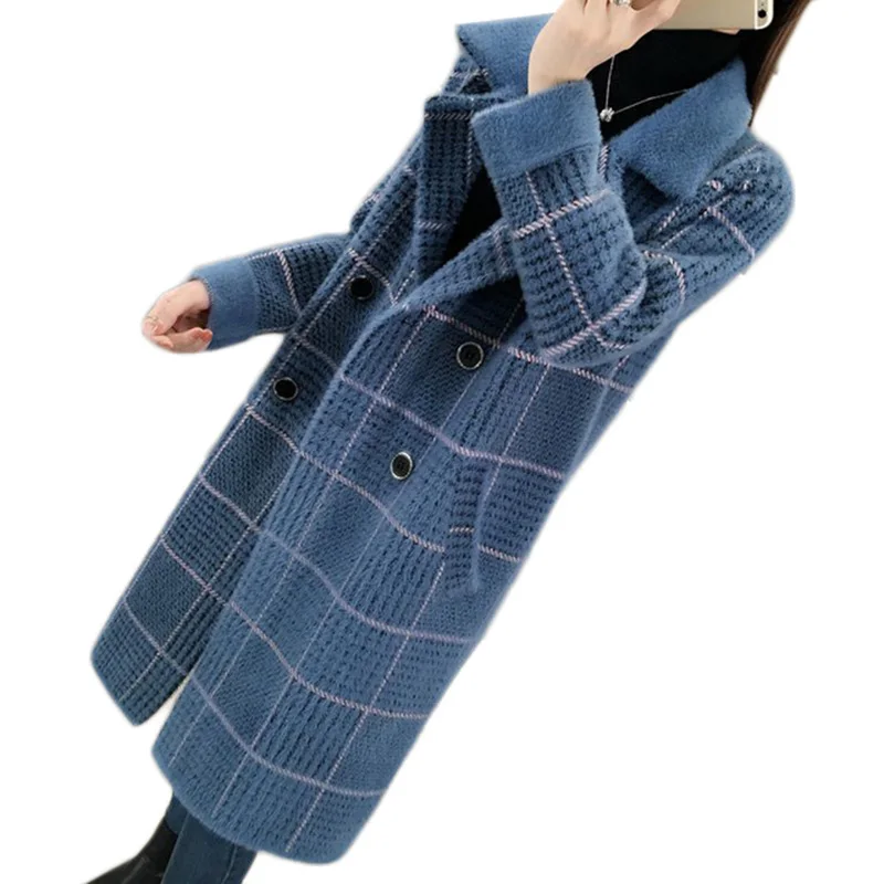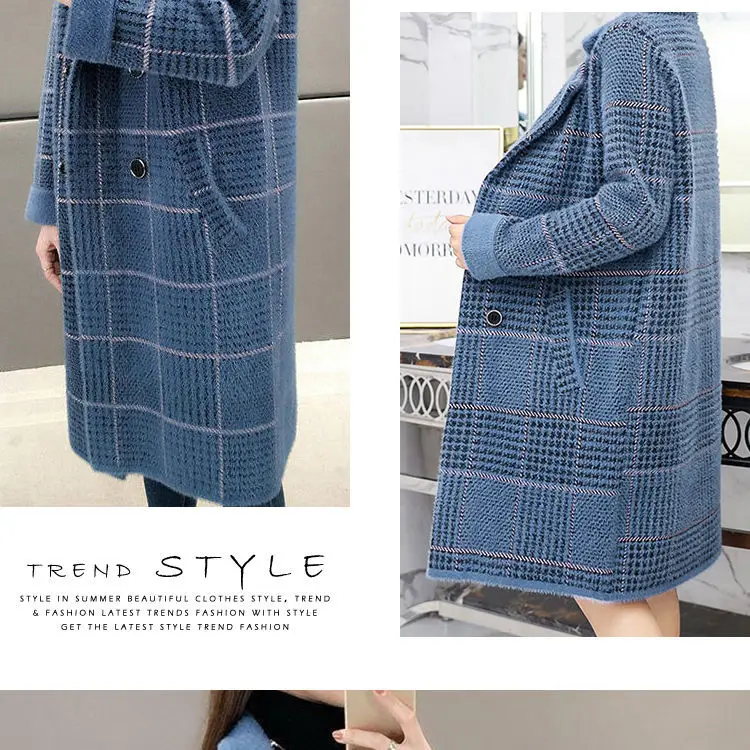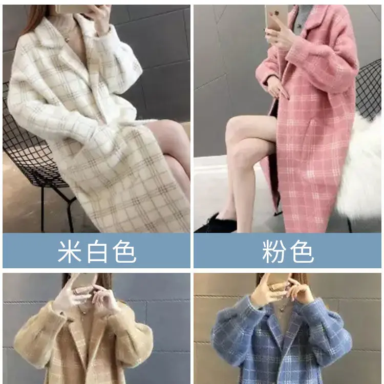 Пальто из искусственной норки и вельвета, женское, длинное шерстяное пальто, осенне-зимнее, толстое, теплое, в клетку