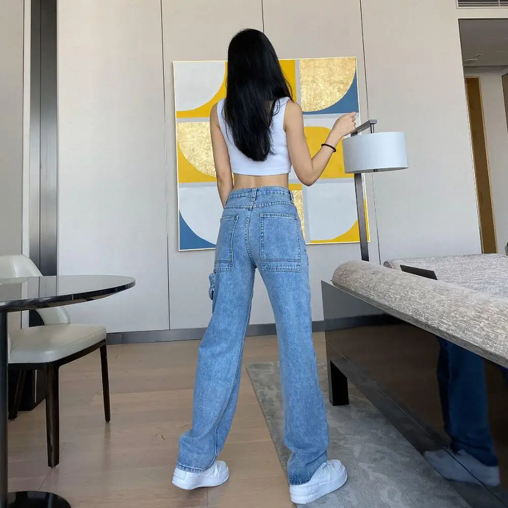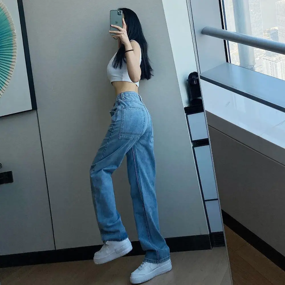 Женские джинсы с завышенной талией, синие прямые брюки большого размера с широкими штанинами в уличном стиле, 2020