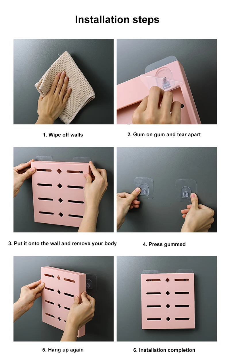 * Шаги установки: 1. Высушите стену; 2. Прикрепите клей и Оторвите его; 3. Поместите его на стену и снимите рамку; 4. Нажмите на клей; 5. Повторно повесить; 6. Установка завершена.