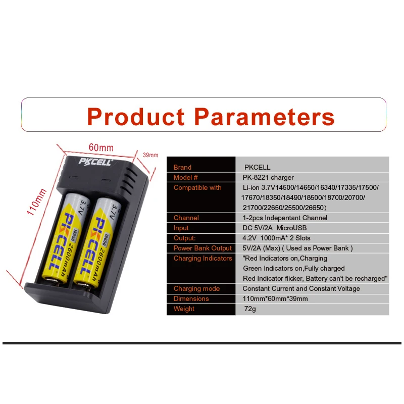 charger OutputDC 4.2V 1000mA*2 USB 5V 2A