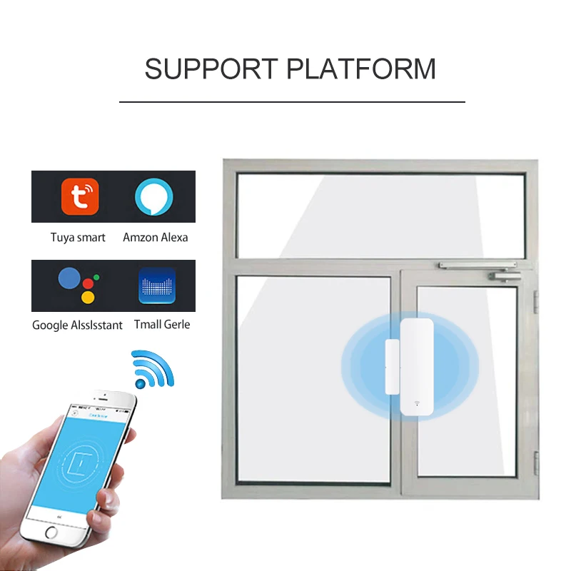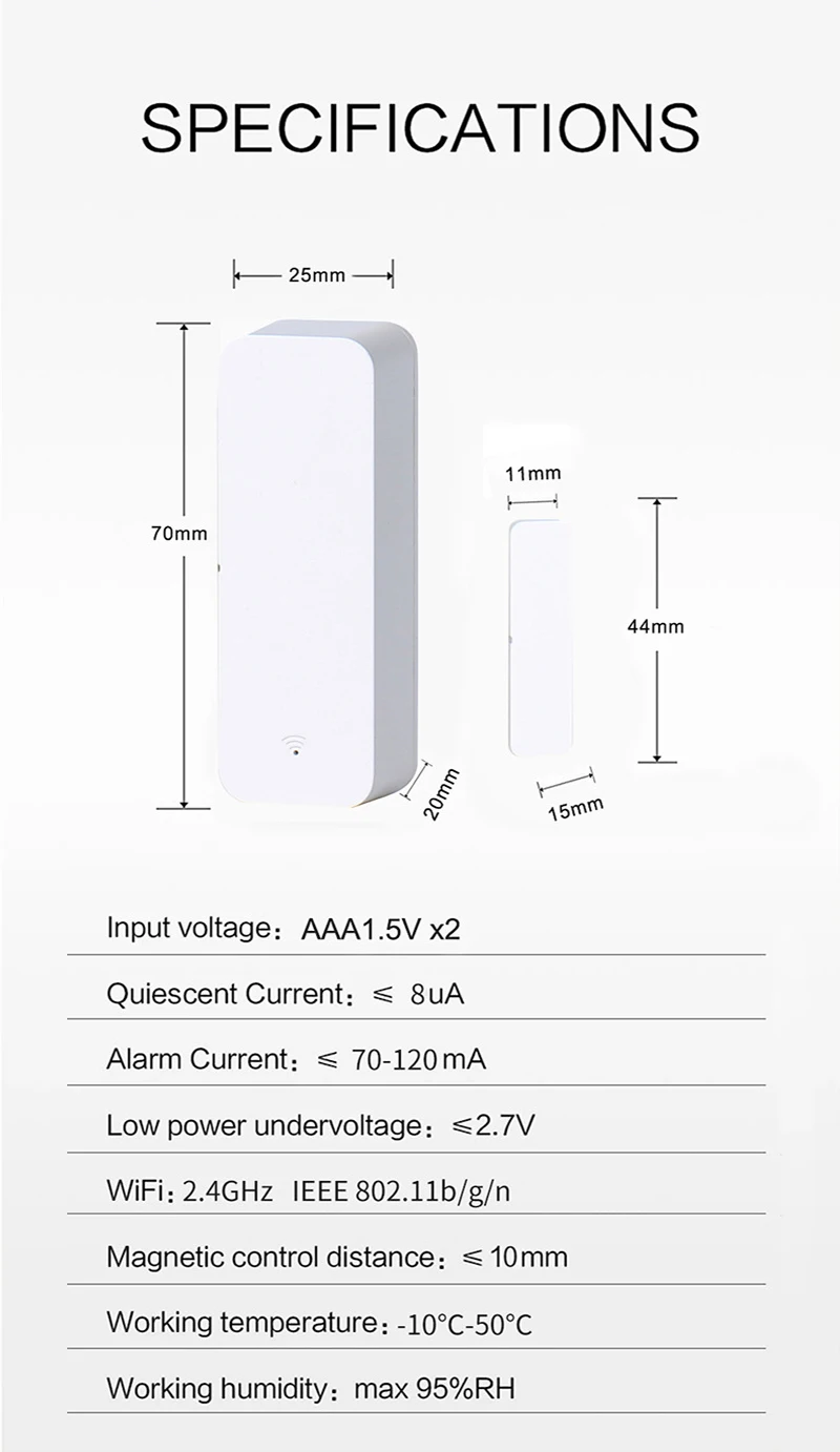 Никаких сложных инструментов для установки не требуется. Датчик может быть установлен с двухсторонней клейкой лентой или винтами (в комплекте) всего за несколько шагов, И загрузите приложение «tuya» или «Smart Life» из магазина GooglePlay или app Store, чтобы добавить устройство для обнаружения состояния вашей двери/окна.