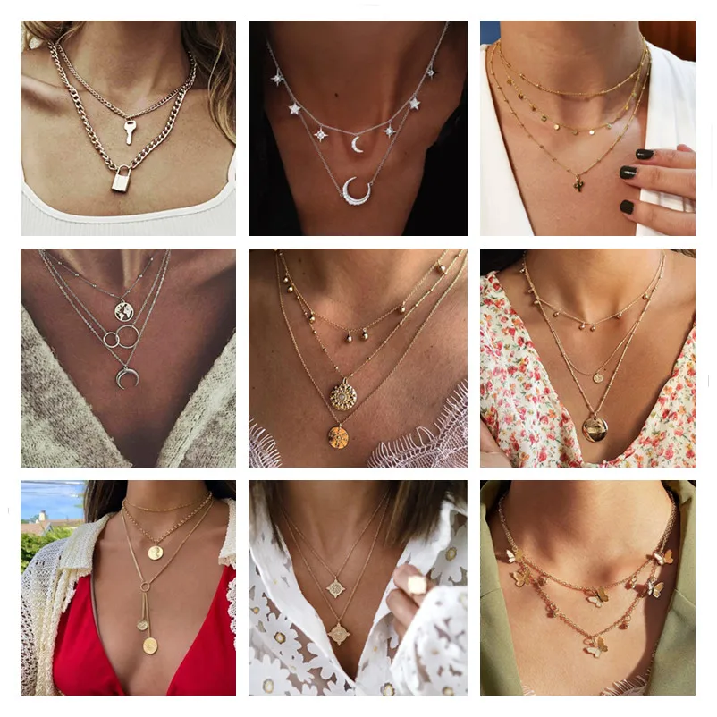 Бохо коробка цепь тумблер застежка золотое ожерелье круг ожерелья для женщин чокер ожерелье многоуровневый замок портрет Butterly подвески