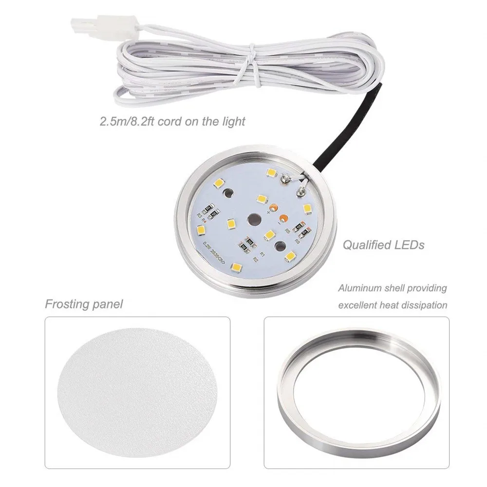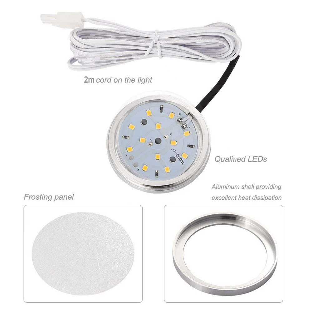 Характеристики:Варианты цвета: теплый белый (3000K), белый (6000K)Удобно: клейкая лента может поддерживать больше дизайнов DIY.Энергосбережение: экономит до 85% энергии.Длительный срок службы: 80000 часов.Светодиодный светильник под шкафом s шайба светильник:Вход: 100-240VACВыход: DC12VМощность: 2 Вт на лампу шкафаЛюмен: 250 лм для 1 шайбы света,CRI: >80Размер: D60 * H8 ммПосылка включает в себя:Светодиодный светильник-шайба (Другие аксессуары не входят в комплект)Функция:1. Применение: шкаф или кухня модификация, книжная полка, дисплей Счетчик светильник ing, ультра-тонкий дисплей светильник ing мода, алюминиевый корпус, охрана окружающей среды, 120 градусов прожектор светильник угол луча.2. Энергосбережение и охрана окружающей среды: 2 Вт светодиодные лампы для шкафа могут заменить 25 Вт теплые белые галогенные лампы (>90% от счета за электричество). Благодаря дизайну защиты глаз молочно-белого цвета освещение шкафа выглядит более мягким.