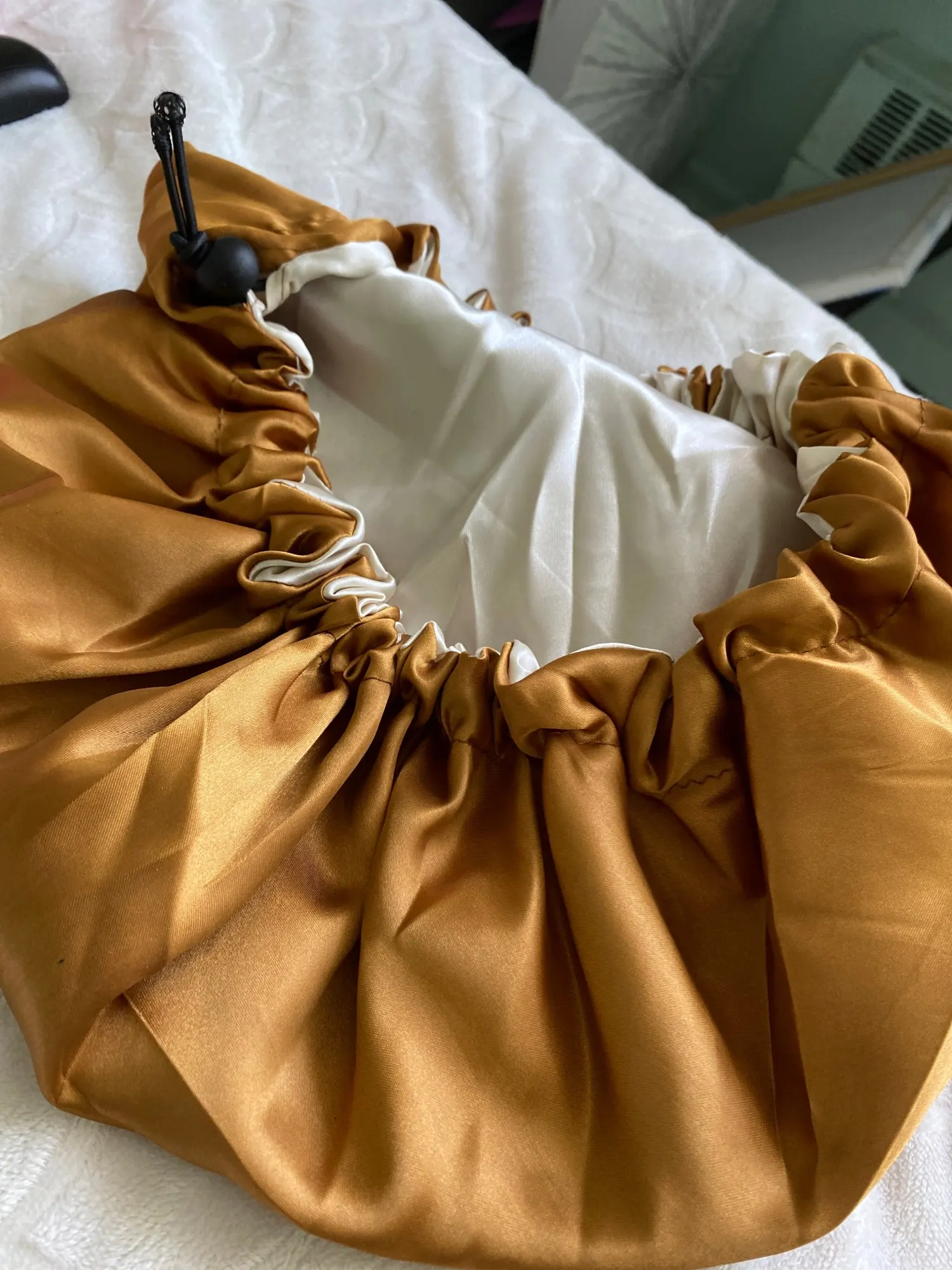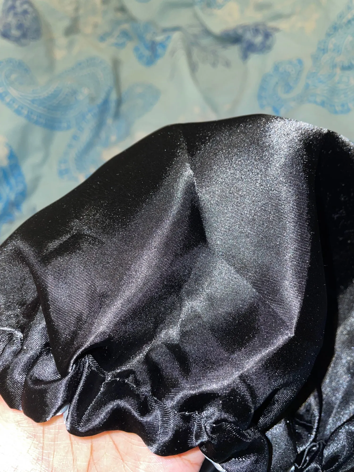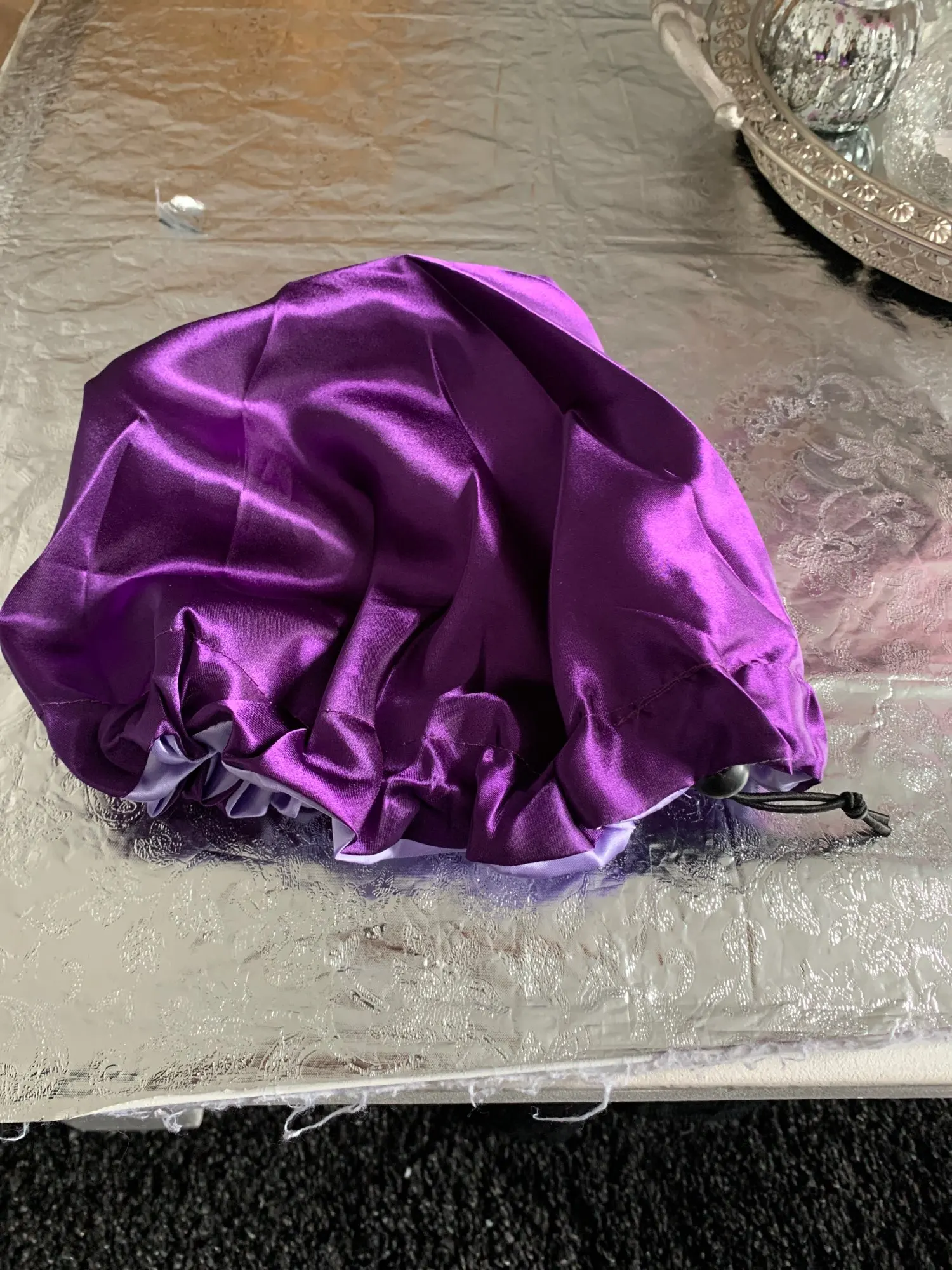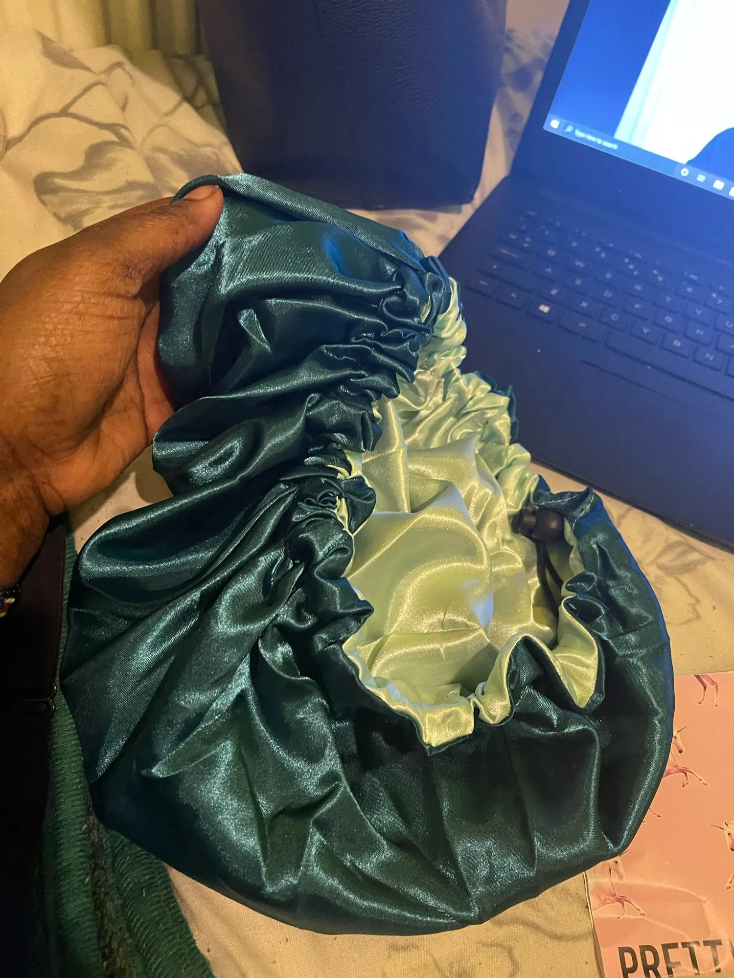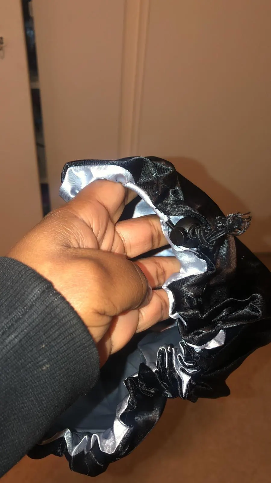 Отлично, пришел быстрее, чем расчетное время, я заказал из Канады. Обе стороны из атласа. Есть Регулируемая нить, которая точно подходит к вашей голове, и она достаточно большая для моих очень длинных и вьющихся волос.