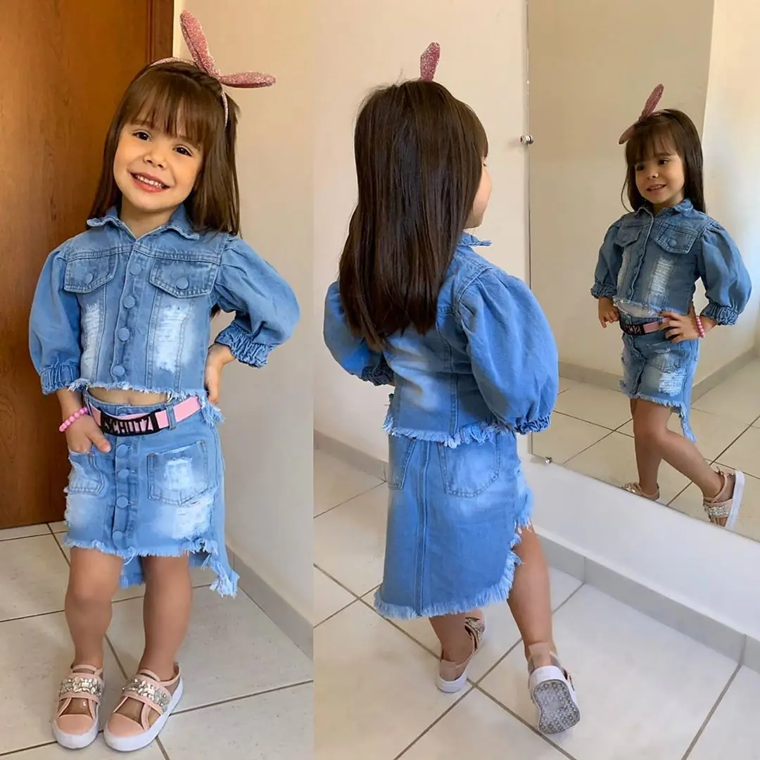 FOCUSNORM От 1 до 6 лет модные Одежда для новорожденных девочек, комплекты синего джинсового цвета с длинными пышными рукавами, однобортная, с круглой горловиной, жaкeт вeрх + карандаш юбки, 2 вещи в комплекте