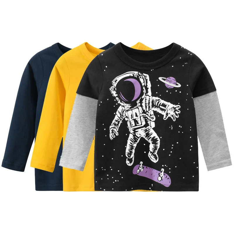Футболки с рисунком космонавта для мальчиков и девочек, хлопковые топы с длинными рукавами и ракетами, детский осенний свитшот, детская одежда, Прямая поставка