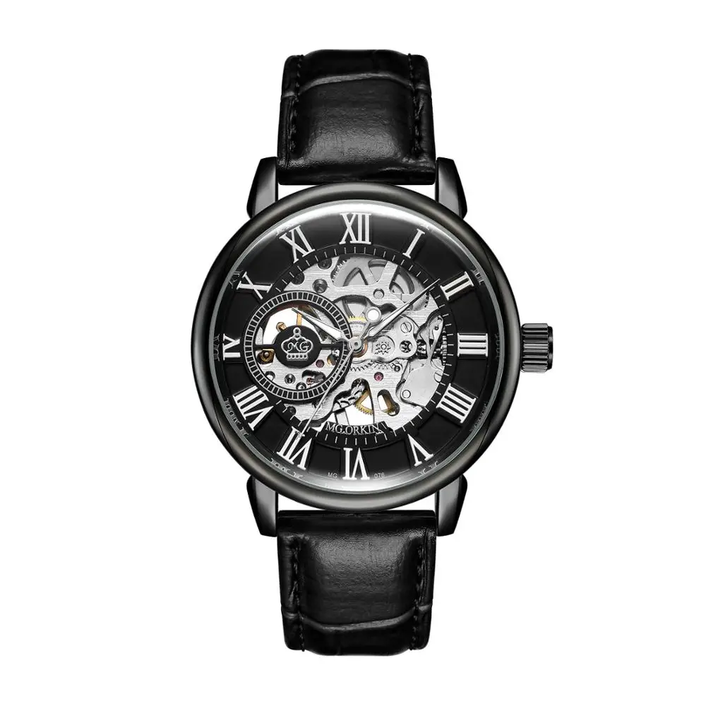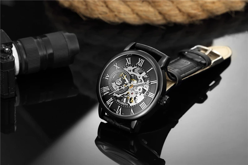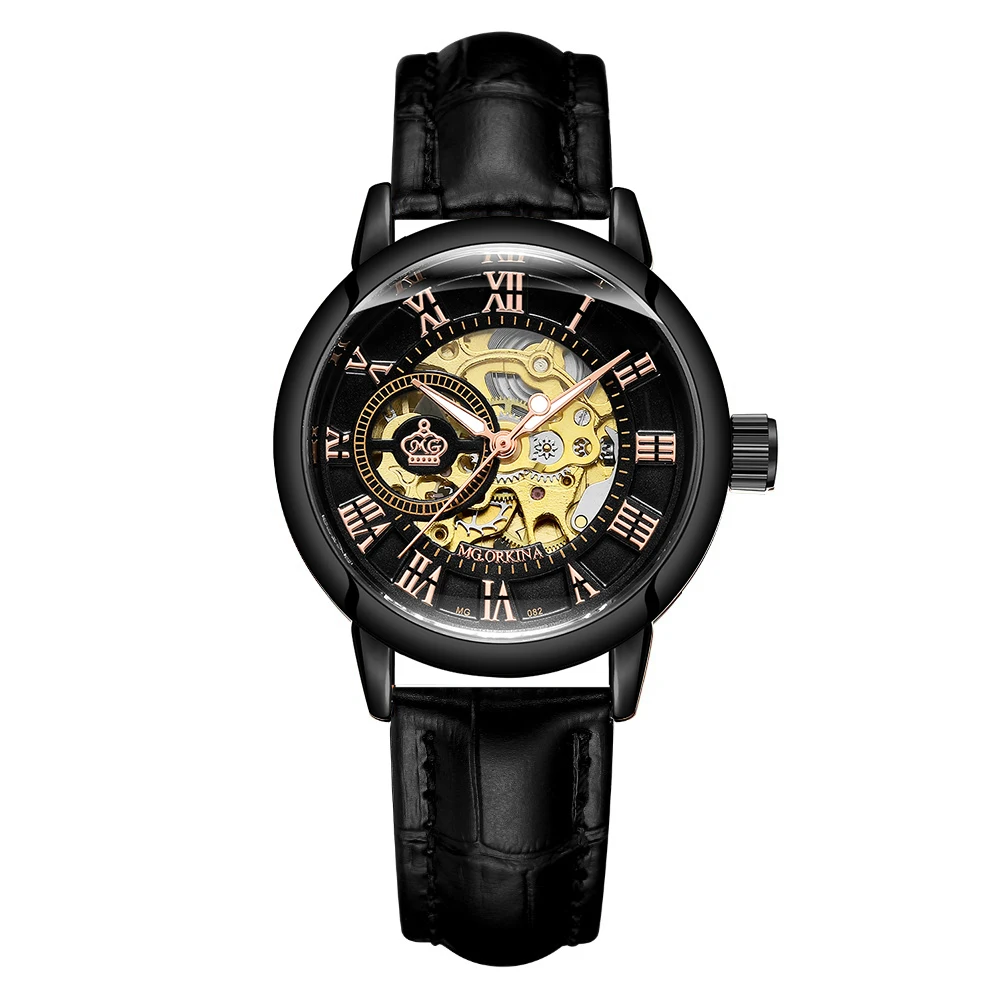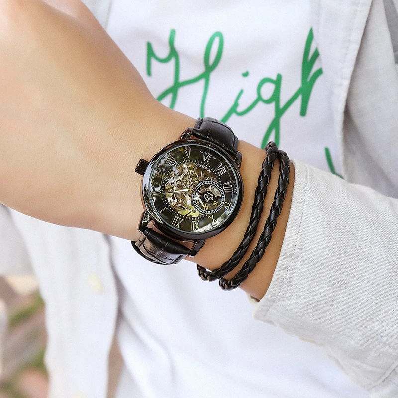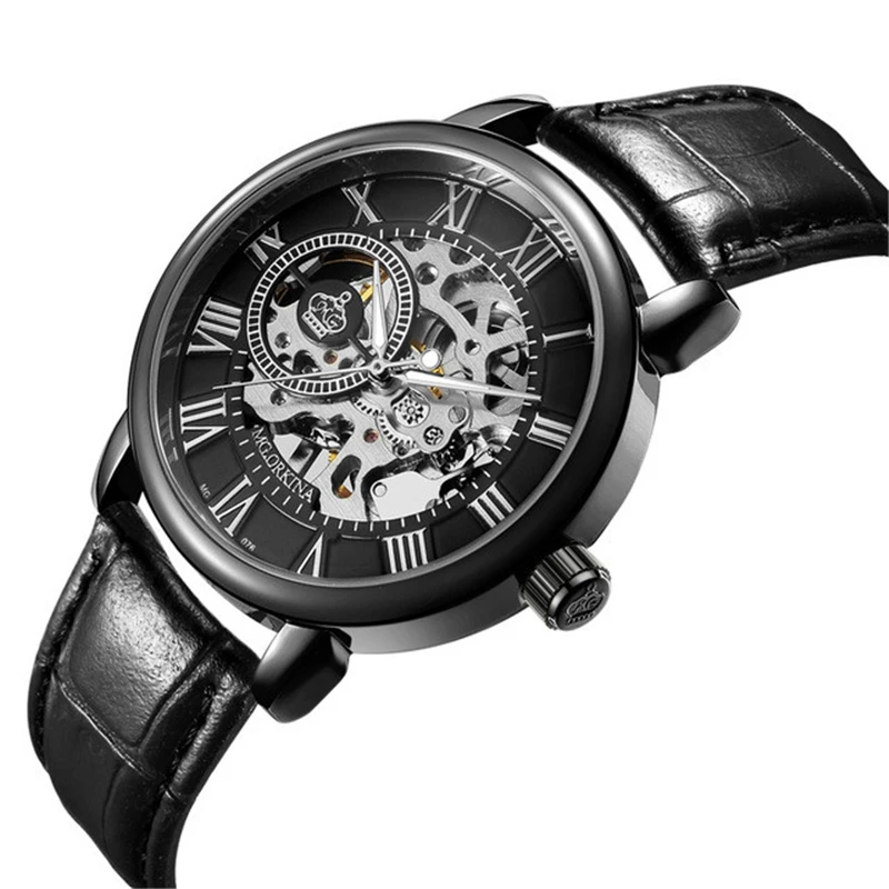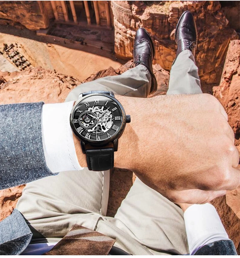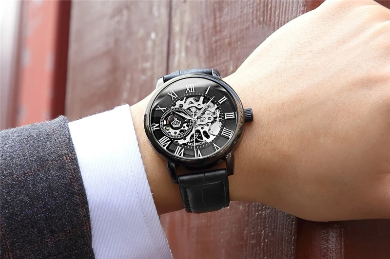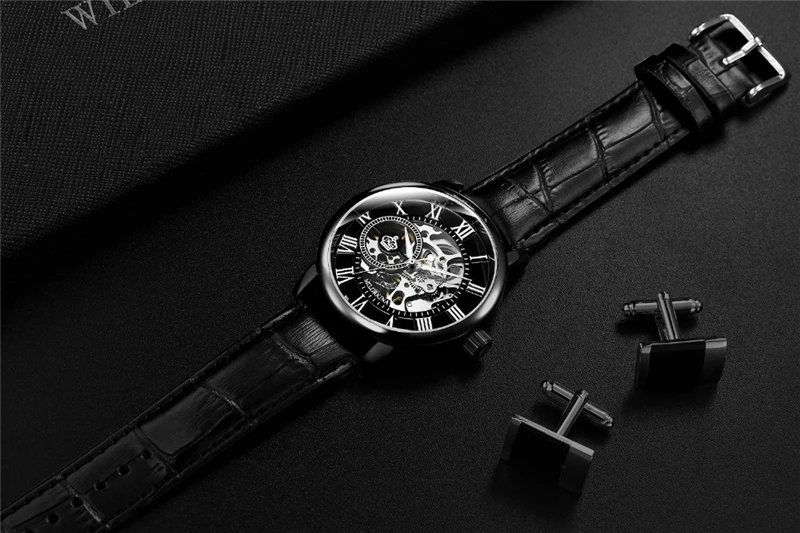 Модные автоматические механические парные часы-скелетоны, черный кожаный ремешок, роскошные брендовые наручные часы унисекс, подарки для пар
