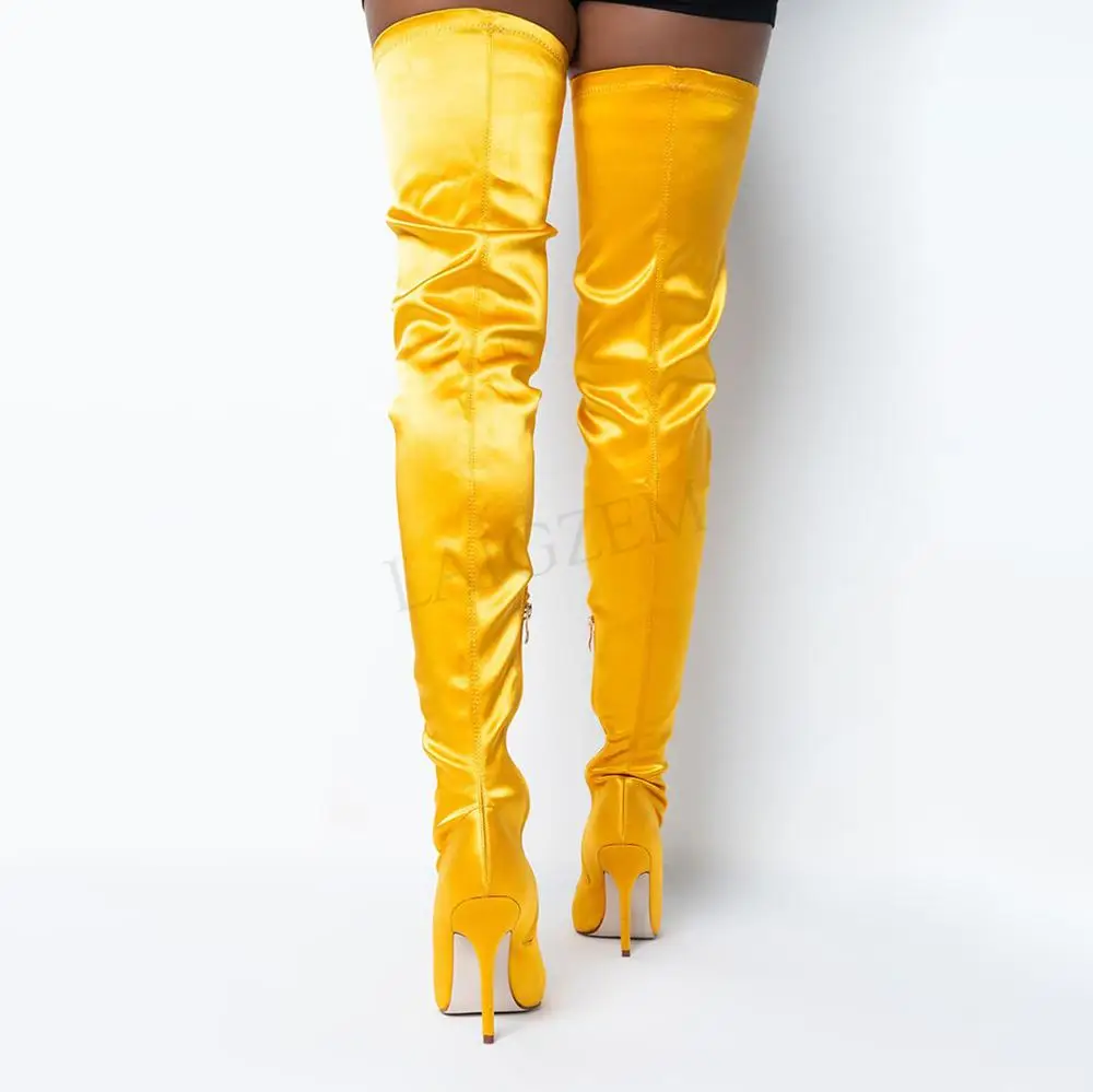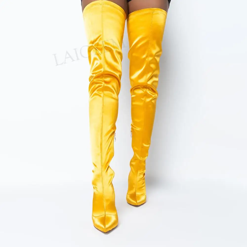 LAIGZEM/женские облегающие высокие сапоги; Атласные сапоги на высоком каблуке с острым носком; Женская обувь на молнии сбоку; Женская обувь на шпильке; Большие размеры 43, 44, 47