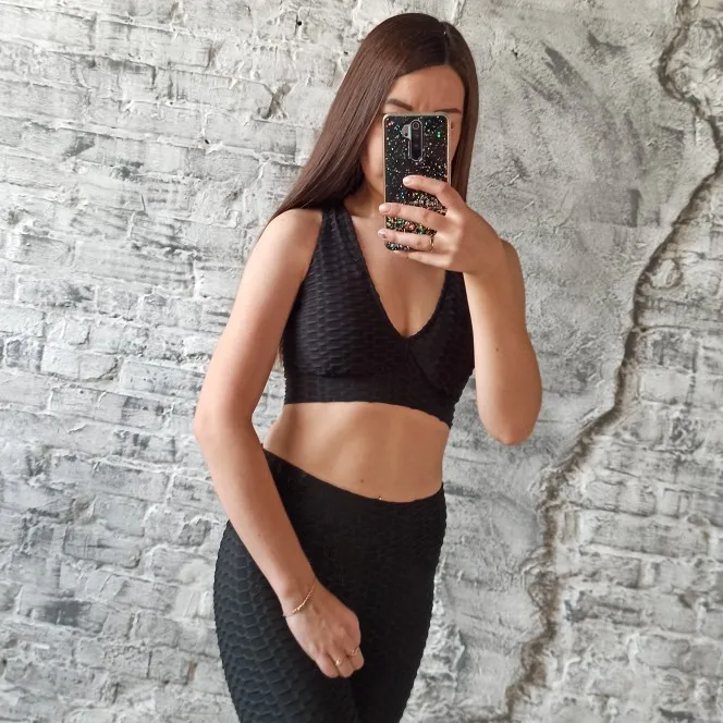 Шикарный спортивный комплект. Полностью соответствуют описанию. Цвет топа и лосины - разный. Мой инстаграм - sveta_vi_ Телеграм - lightandfashion Ссылка: https://s.click.aliexpress.com/e/_9A65Yq Качество отличное, прошит аккуратно, каких-либо дефектов не обнаружила. Выполнен из довольно эластичной ткани. Лосины с завышенной талией. Костюм идеально сел по фигуре и не сковывает движения. На мне размер S. Мои параметры: бюст 83 см, талия 60 см, бедра 90 см, рост 164 см. Материал ребристый, плотный, мягкий, эластичный, приятный к телу и совершенно не просвечивается. Эффект пуш-ап достигается за счет швов на попе. Ссылка: https://s.click.aliexpress.com/e/_9A65Yq